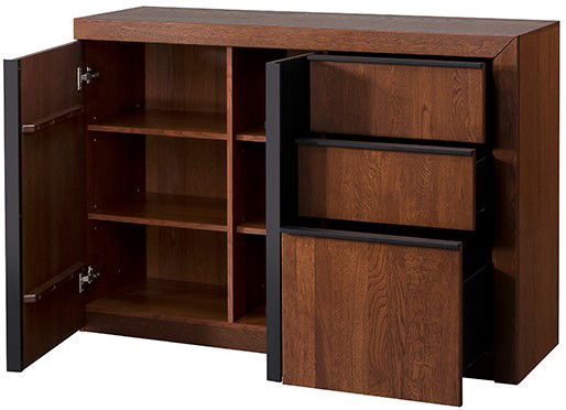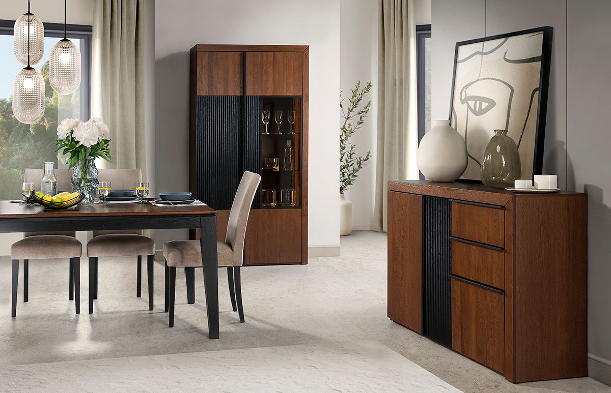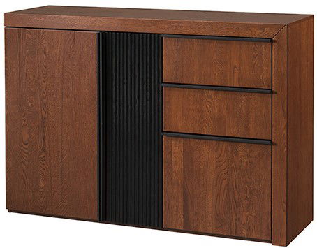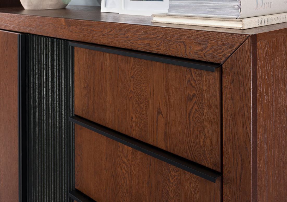 Ο κομψός και λειτουργικός μπουφές Bastien είναι ένα ξεχωριστό κομμάτι για κάθε μοντέρνα τραπεζαρία ή σαλόνι. Ο συνδυασμός ενός ζεστού ξύλινου φινιρίσματος και μιας κομψής μαύρης προφοράς δημιουργεί μια σύγχρονη εμφάνιση. Ο ενσωματωμένος φωτισμός αναδεικνύει τα αγαπημένα σας διακοσμητικά αντικείμενα και προσθέτει μια ζεστή λάμψη στο χώρο.