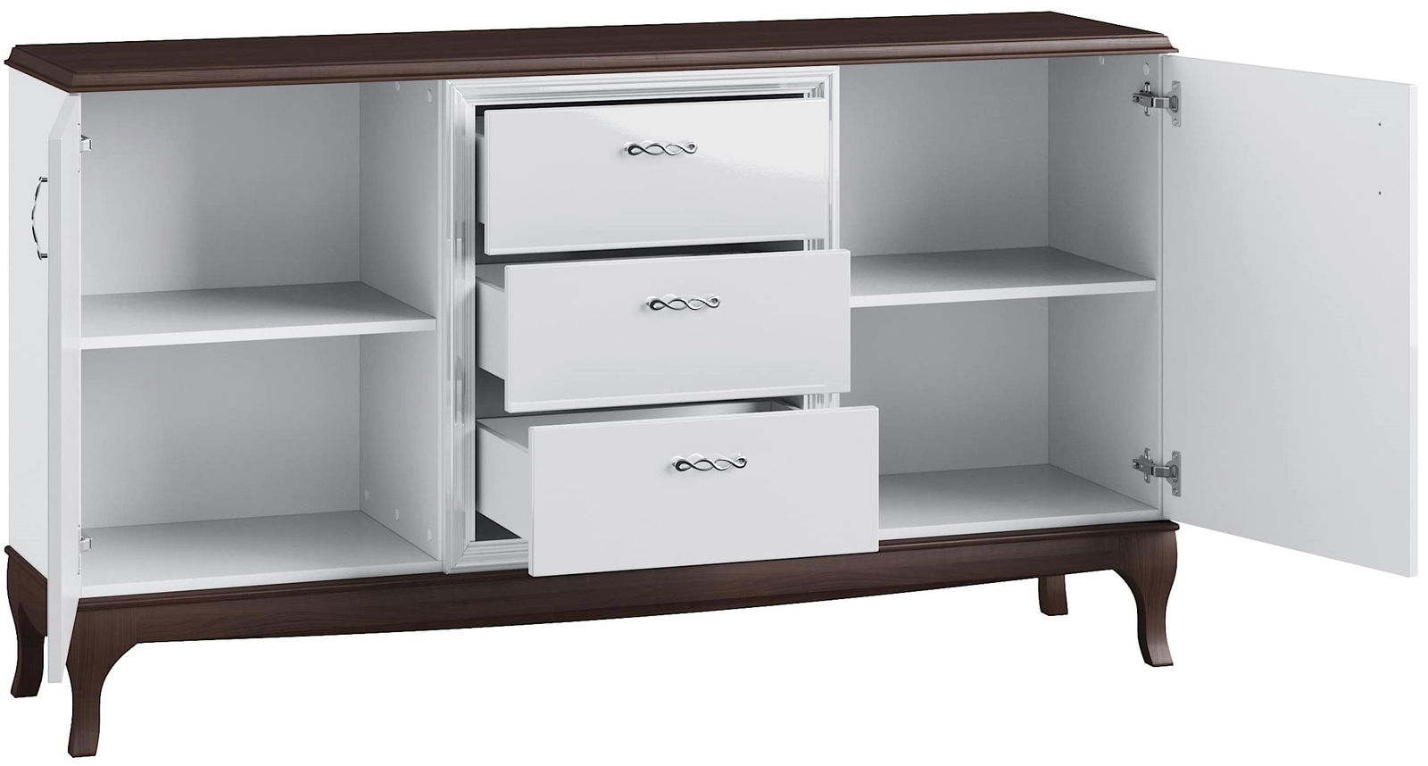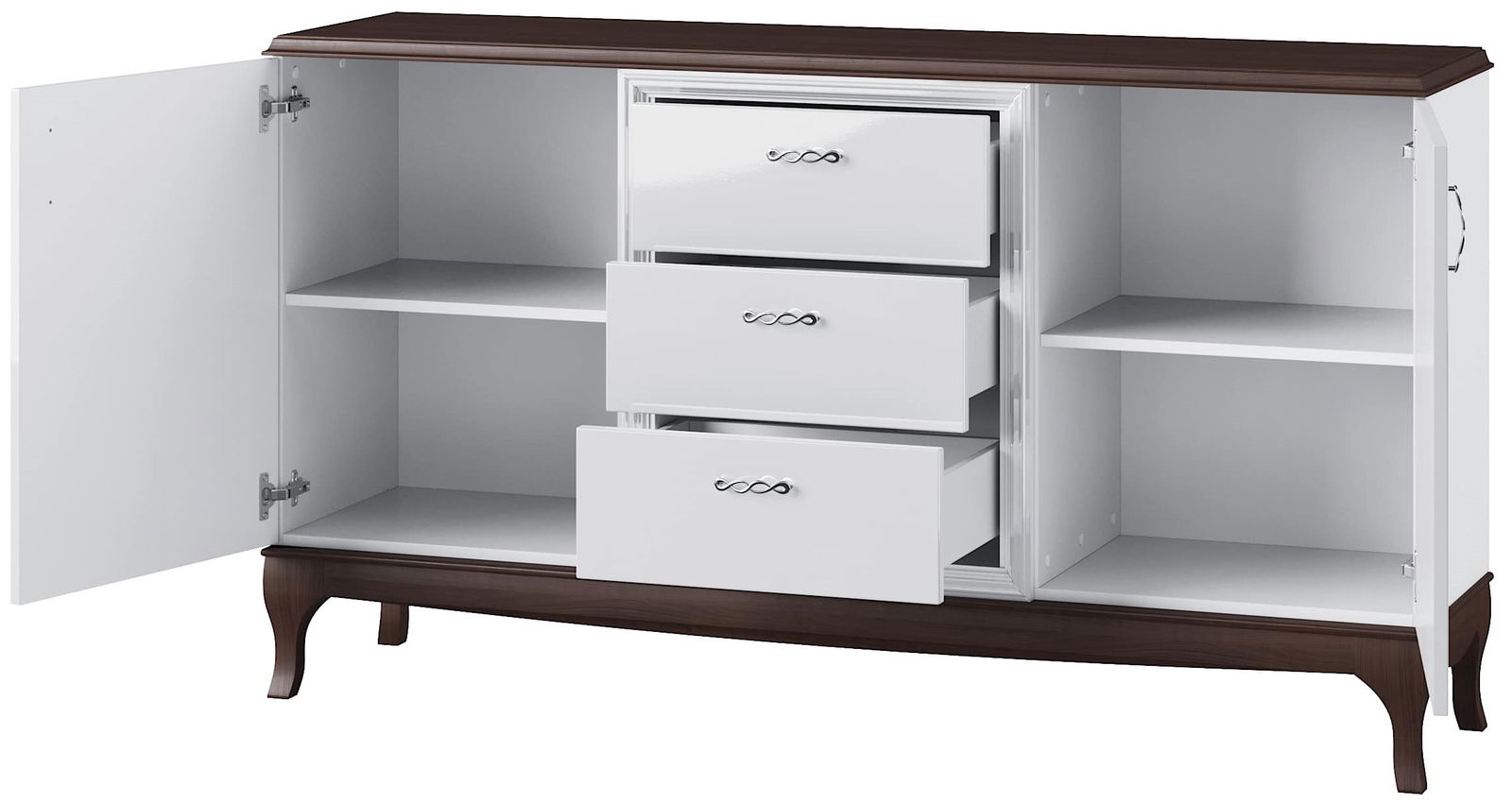 Ο μπουφές Carrera plus αποτελεί ένα έπιπλο μοναδικής κομψότητας, χάρη στο σχεδιασμό του σε αρχοντικό vintage style. Τα retro στοιχεία όπως τα καμπυλόγραμμα πόδια ή τα μεταλλικά χερουλάκια με αντικέ σχέδιο, χαρίζουν στο έπιπλο πολυτελή όψη και φινέτσα. Η επιφάνεια σε υπέροχο καφέ mocca χρώμα σε συνδυασμό με τα μέρη από φυσικό ξύλο οξιάς, του χαρίζουν ζωή και εγγυώνται πως θα μείνει στην κατοχή σας για πολλά χρόνια!