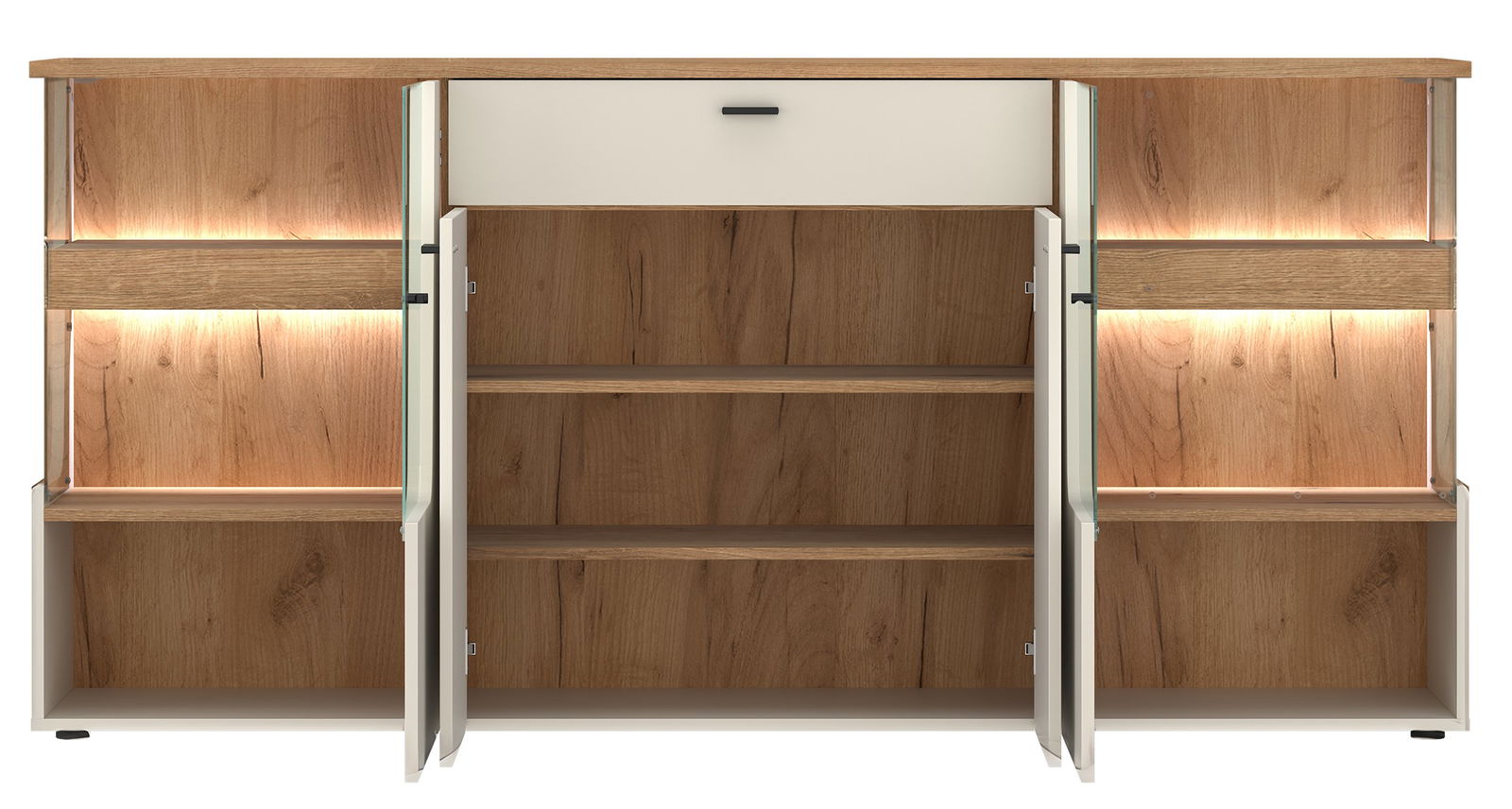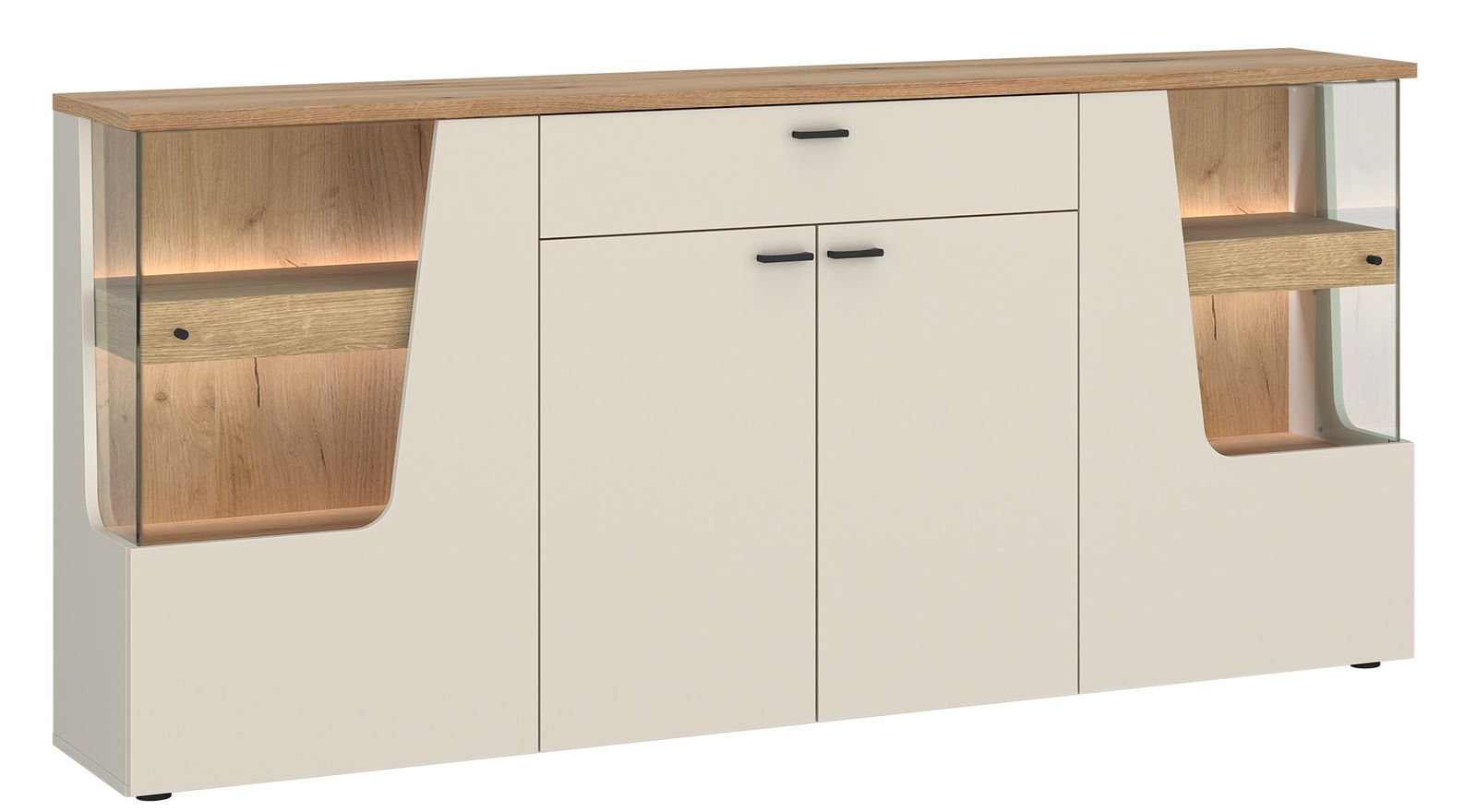 Μπουφές Cutou με σύγχρονο σχεδιασμό. Διαθέτει ντουλάπια, συρτάρι και γυάλινες βιτρίνες με φωτισμό LED (πωλείται χωριστά), ιδανικές για διακόσμηση και αποθήκευση. Συνδυάζει κομψότητα και λειτουργικότητα, ταιριάζει σε κάθε μοντέρνο σαλόνι ή τραπεζαρία. Συνδυάστε τον μπουφέ με τα υπόλοιπα έπιπλα της σειράς και δημιουργήστε ένα ολοκληρωμένο σετ σαλονιού.