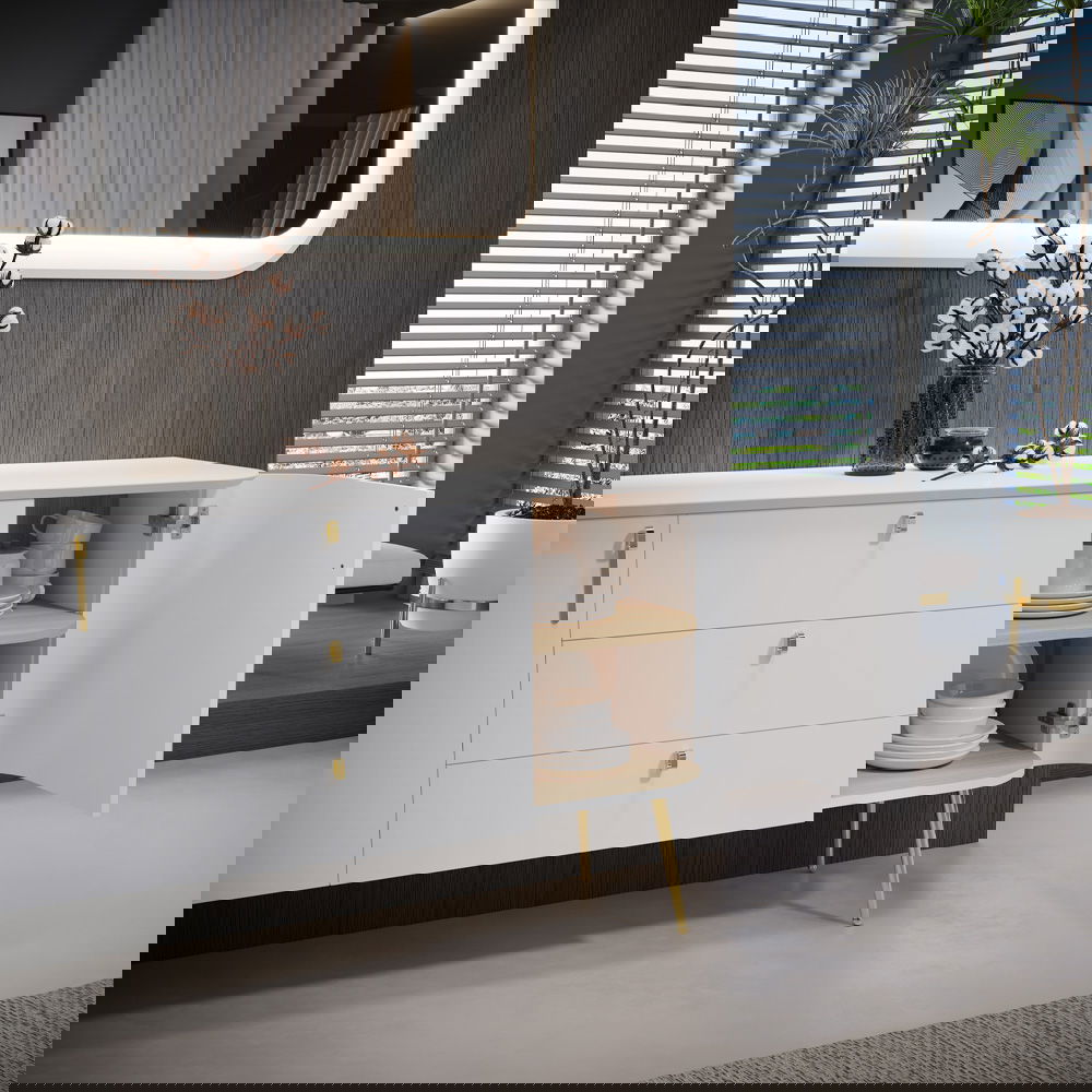 Αναβαθμίστε την τραπεζαρία ή το σαλόνι σας με τον κομψό και πολυλειτουργικό μπουφέ Galleria. Συνδυάζοντας ένα όμορφο φινίρισμα με φυσικό εφέ ξύλου με έναν έξυπνο συνδυασμό επιλογών αποθήκευσης και έκθεσης, αυτό το έπιπλο χρησιμεύει τόσο ως πρακτικός οργανωτής όσο και ως εντυπωσιακό διακοσμητικό στοιχείο για το σπίτι σας.