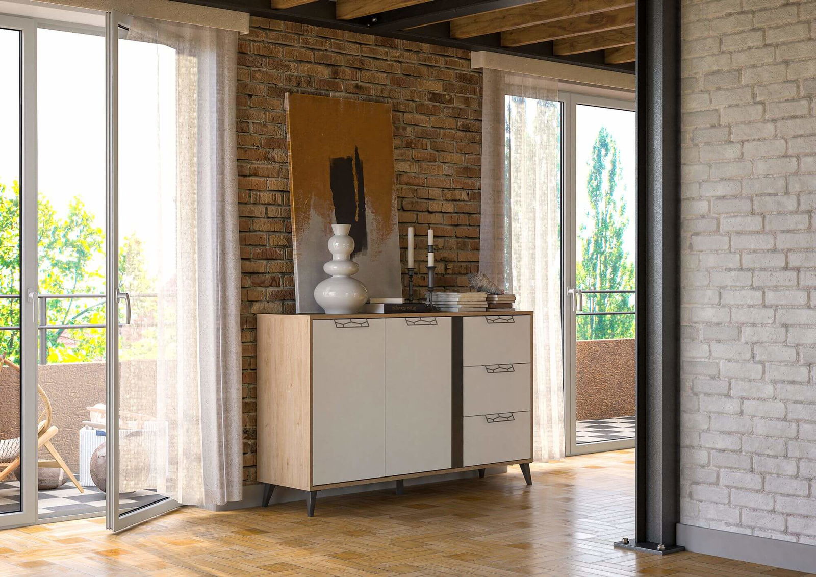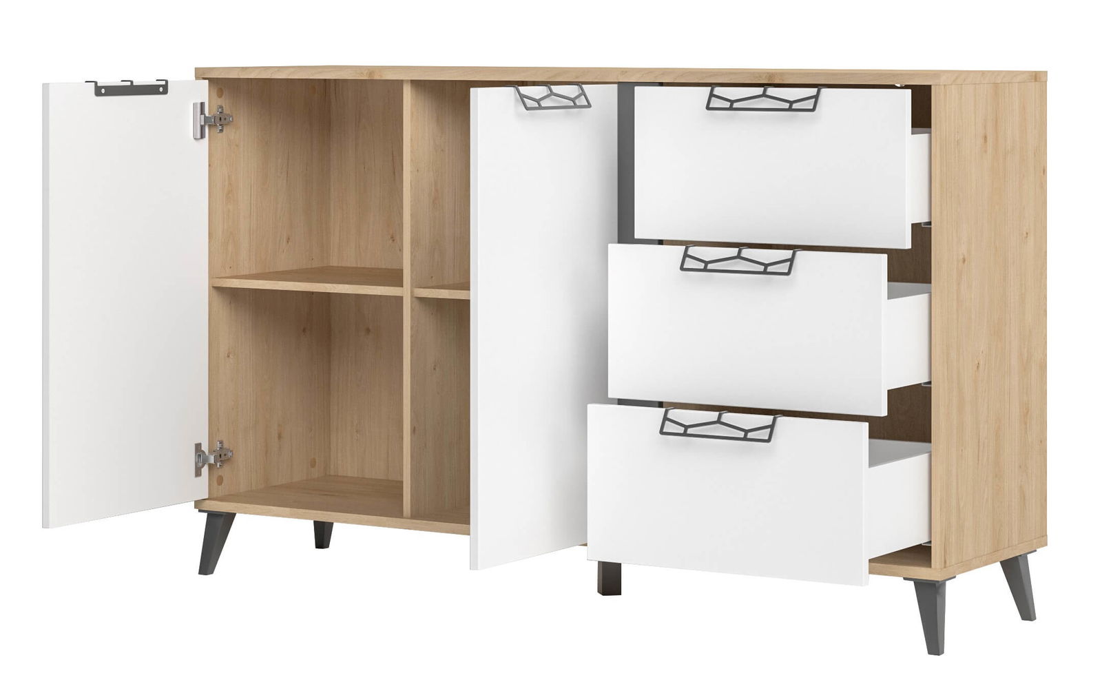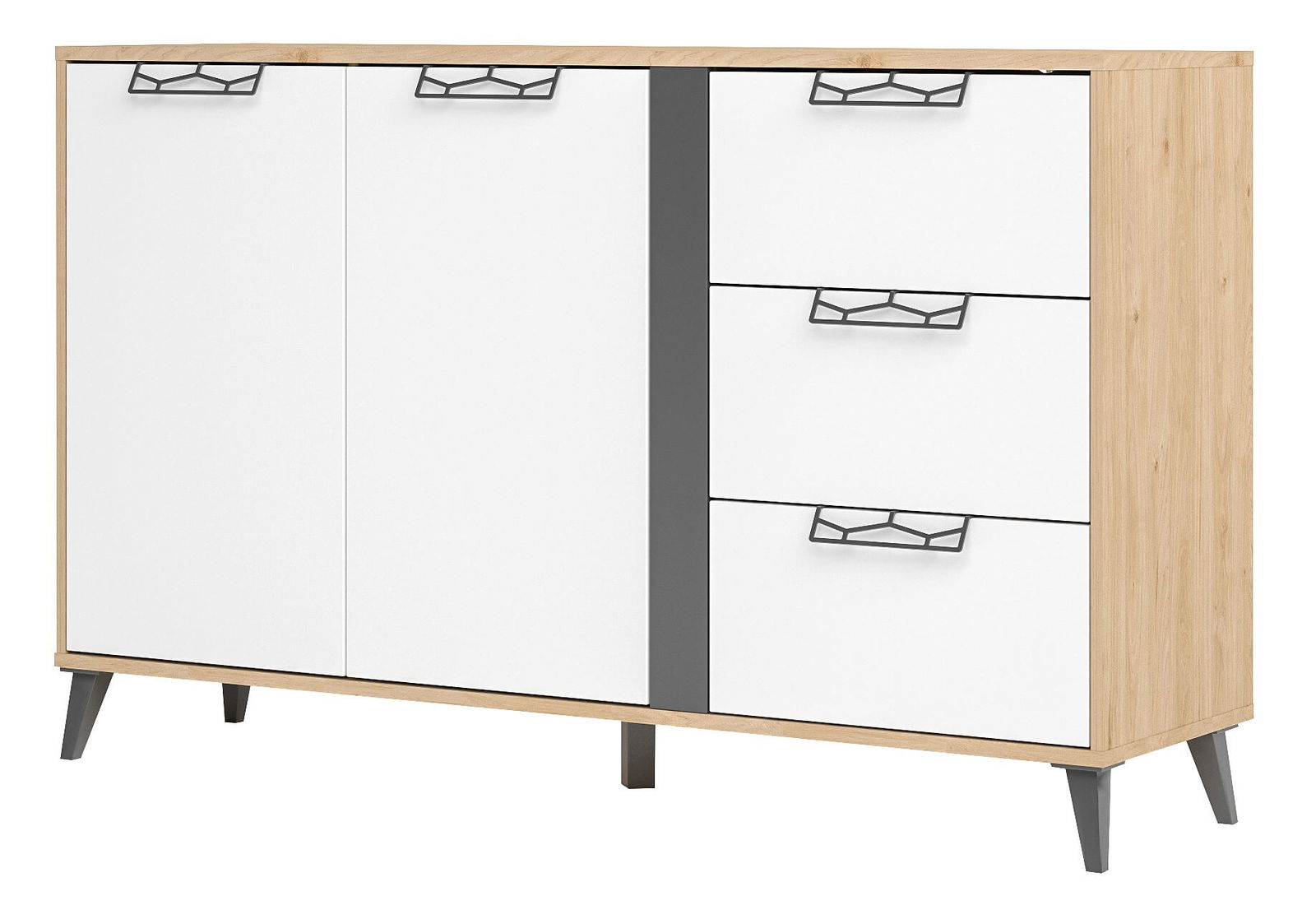 Μπουφες Janet, μια μοντέρνα και κομψή επιλογή για να ανανεώσετε την διακόσμηση του εσωτερικού σας χώρου. Διαθέτει εξαιρετικά πρακτικούς χώρους αποθήκευσης χάρη στα τρία ευρύχωρα συρτάρια και τα δύο ντουλάπια. Συνδυάζεται ιδανικά με τα έπιπλα της σειράς Janet.