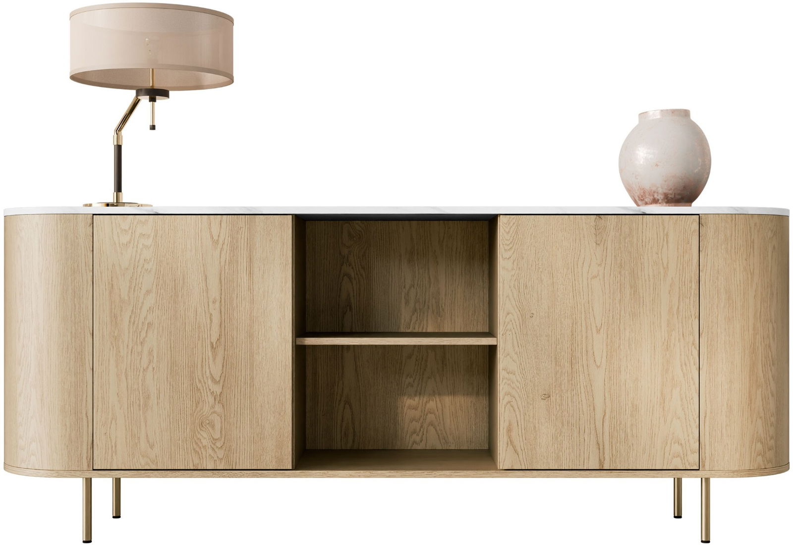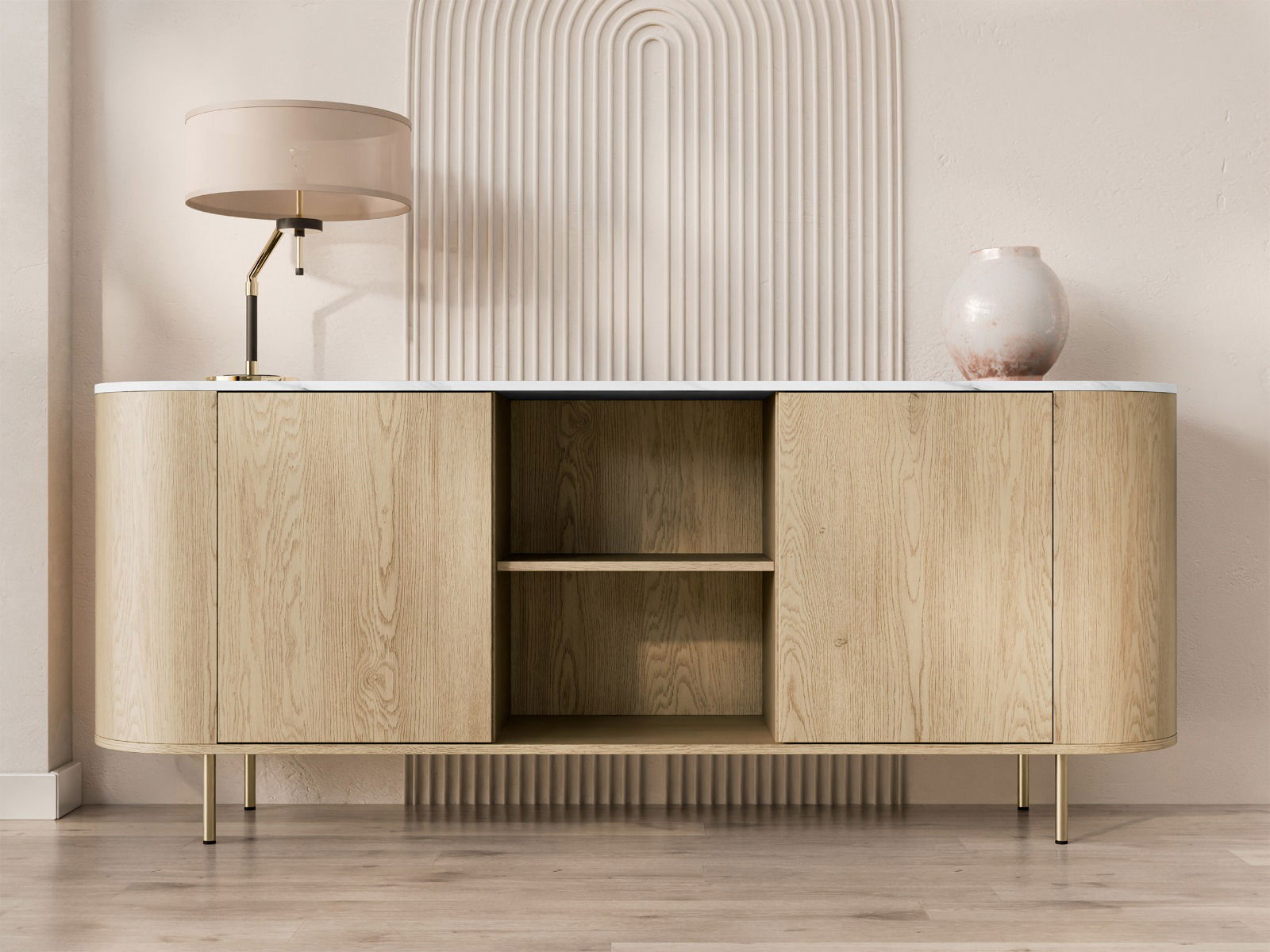 Ο μπουφές Lygrint II συνδυάζει κομψότητα και λειτουργικότητα σε στυλ Japandi. Με στρογγυλεμένες πλευρές, διακριτικά μαύρα πόδια και επιφάνεια με λεπτό μαρμάρινο μοτίβο, προσφέρει μοντέρνα αισθητική και πρακτική αποθήκευση. Διαθέτει ευρύχωρα ντουλάπια, δύο μεγάλες ραφιέρες και πλατύ επάνω μέρος για διακόσμηση. Ιδανική για σαλόνι ή υπνοδωμάτιο.