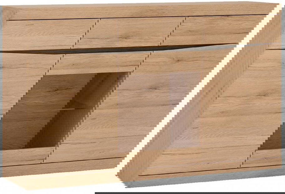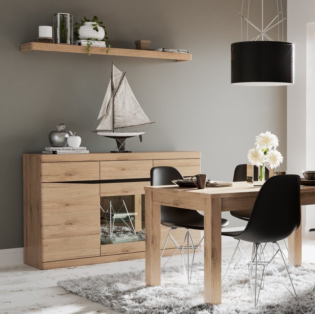 Μπουφές Santiago γενναιόδωρων διαστάσεων, σε γήινους τόνους φυσικού ξύλου που θα δώσουν στο χώρο ζωντάνια και φιλόξενη διάθεση! Το ιδιαίτερα ευρύχωρο εσωτερικό του είναι η τέλεια επιλογή για τη φύλαξη υαλικών, σκευών μαγειρικής ή σερβίτσιων. Χαρακτηριστική λεπτομέρεια της σειράς Santiago αποτελούν τα σκαλιστά σχέδια σε βέγγε χρώμα που χρησιμεύουν και σαν λαβές.
