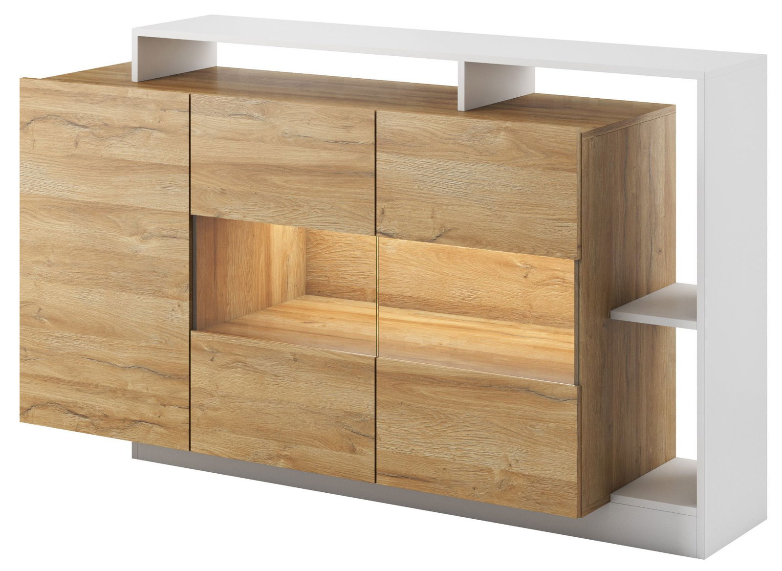 Προσθέστε στο σαλόνι σας αποθηκευτικό χώρο με στυλ, με τον μπουφέ της σειράς Oak. Διαθέτει στο αριστερό μέρος ένα ντουλάπι με ράφι εσωτερικά. Στη μέση υπάρχουν δύο γυάλινες πόρτες για την έκθεση διακοσμητικών ή υαλικών, με τρία ράφια στο εσωτερικό.