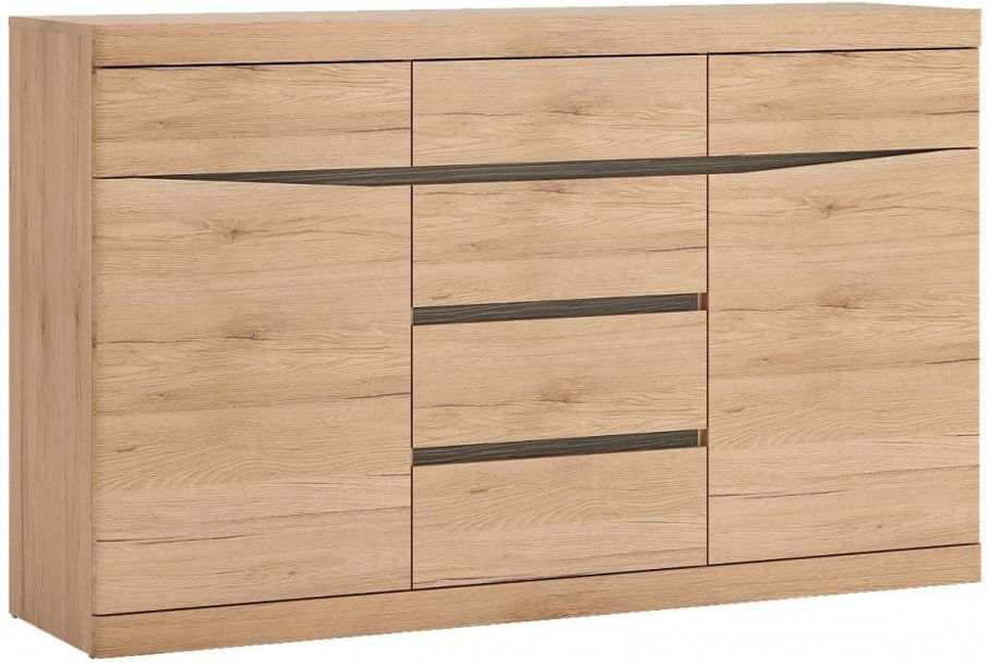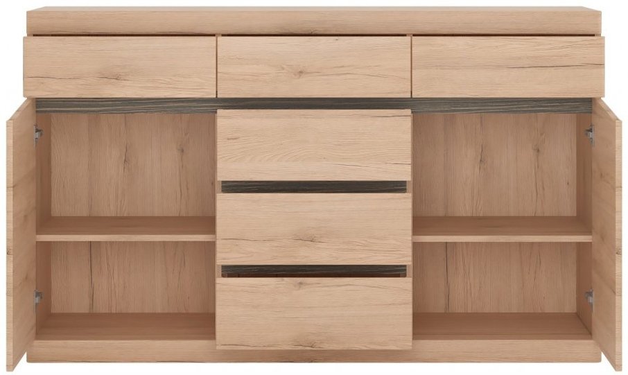 Μπουφές Santiago γενναιόδωρων διαστάσεων, σε γήινους τόνους φυσικού ξύλου που θα δώσουν στο χώρο ζωντάνια και φιλόξενη διάθεση! Το ιδιαίτερα ευρύχωρο εσωτερικό του είναι η τέλεια επιλογή για τη φύλαξη υαλικών, σκευών μαγειρικής ή σερβίτσιων. Χαρακτηριστική λεπτομέρεια της σειράς Santiago αποτελούν τα σκαλιστά σχέδια σε βέγγε χρώμα που χρησιμεύουν και σαν λαβές.