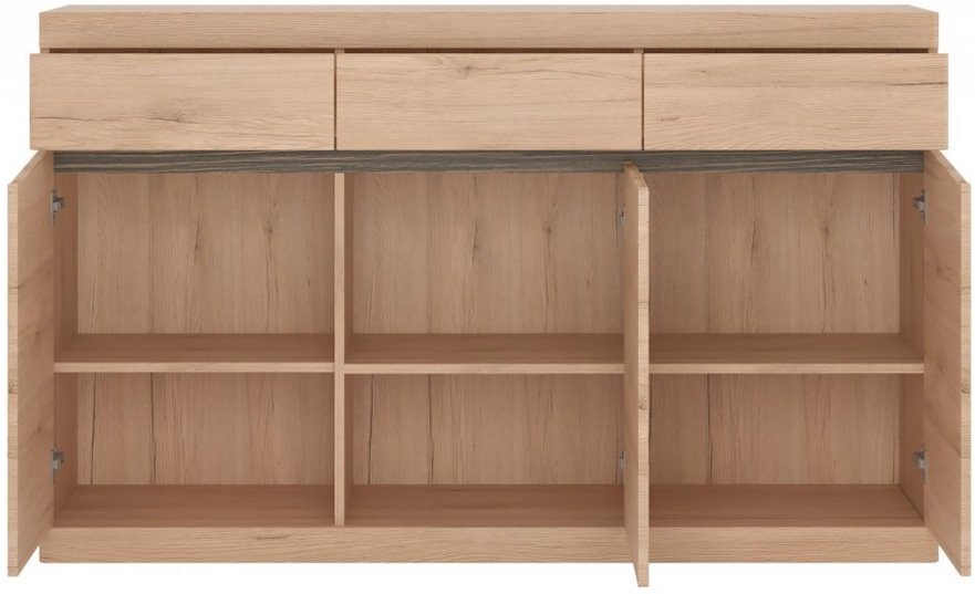 Μπουφές Santiago γενναιόδωρων διαστάσεων, σε γήινους τόνους φυσικού ξύλου που θα δώσουν στο χώρο ζωντάνια και φιλόξενη διάθεση! Το ιδιαίτερα ευρύχωρο εσωτερικό του είναι η τέλεια επιλογή για τη φύλαξη υαλικών, σκευών μαγειρικής ή σερβίτσιων. Χαρακτηριστική λεπτομέρεια της σειράς Santiago αποτελούν τα σκαλιστά σχέδια σε βέγγε χρώμα που χρησιμεύουν και σαν λαβές.