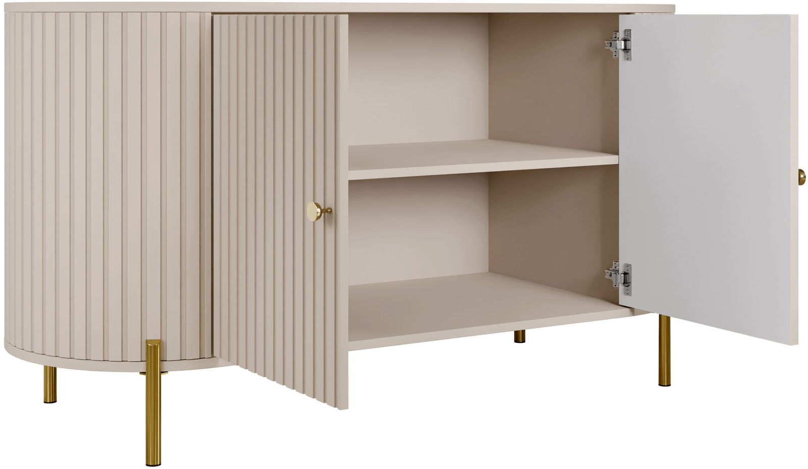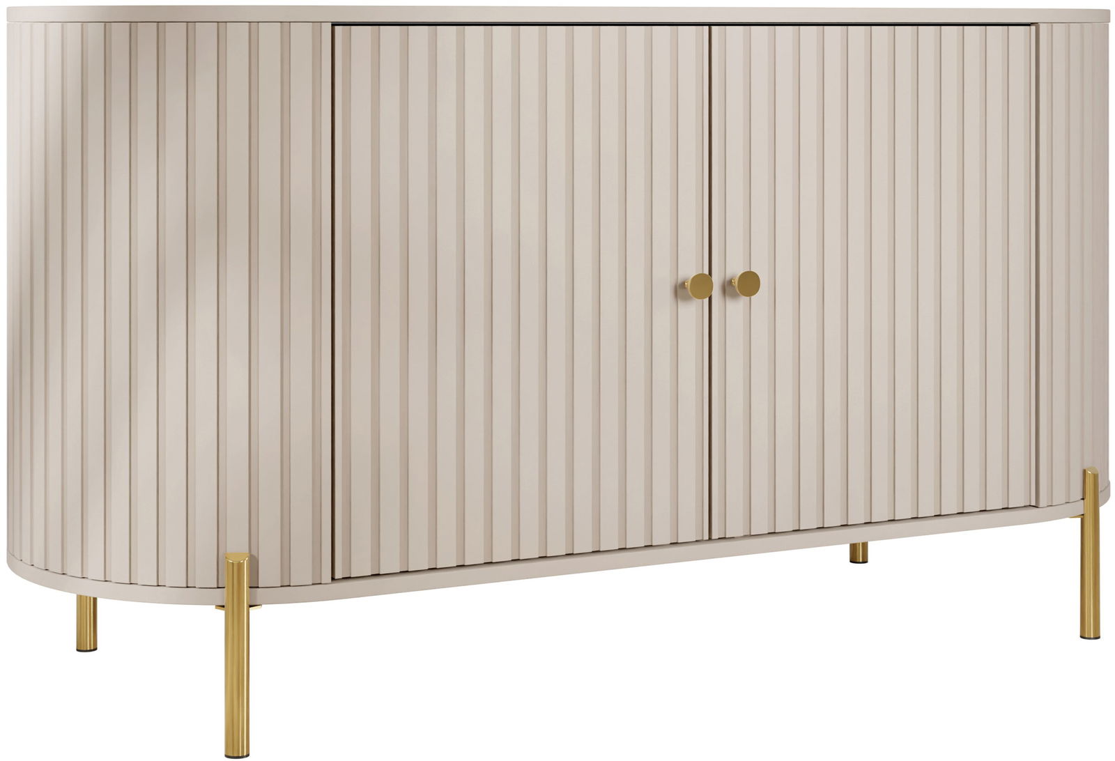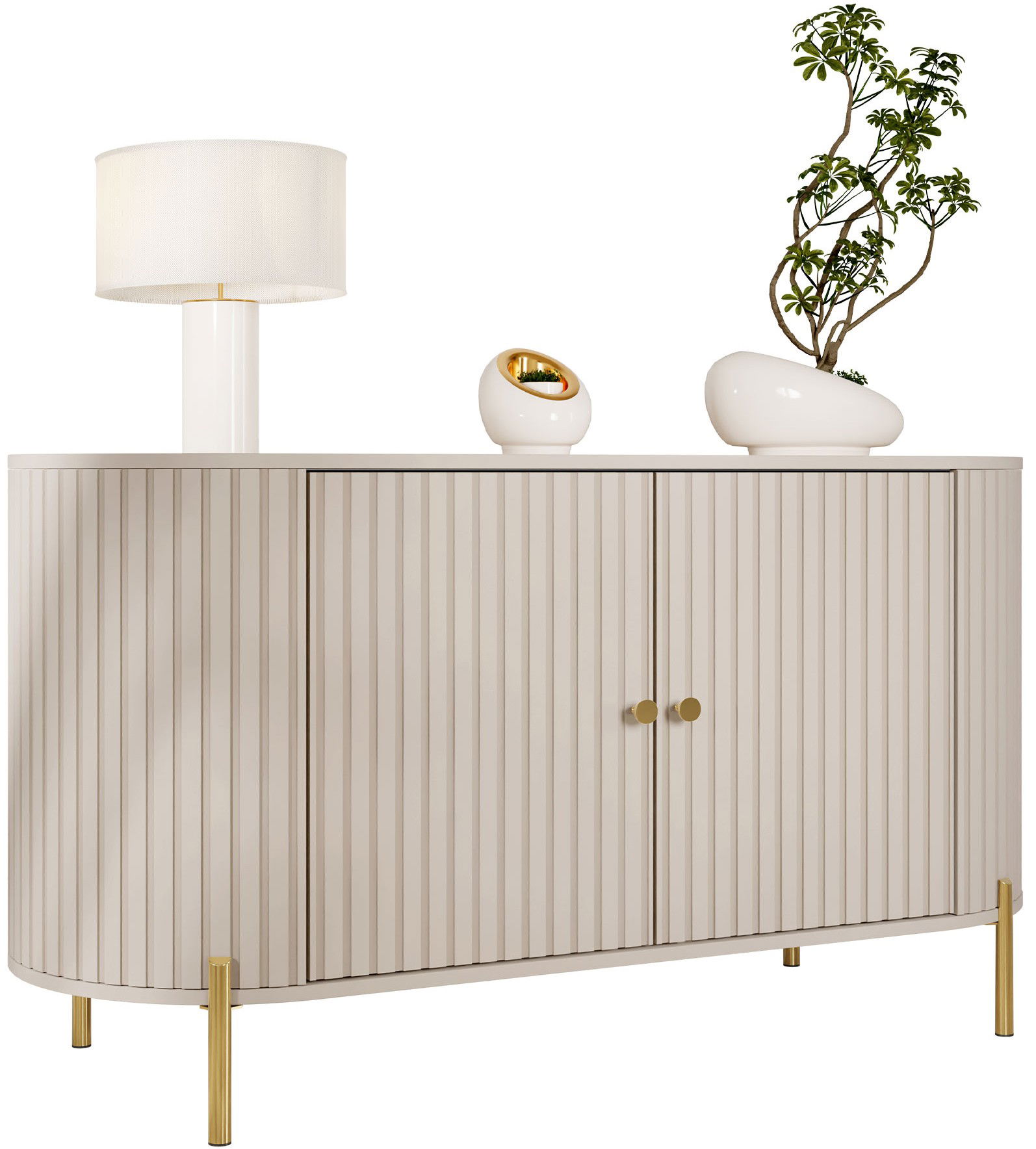 Ο μπουφές Sepiroz I ξεχωρίζει με τα στρογγυλεμένα πλαϊνά και τις διακοσμητικές αυλακώσεις στις προσόψεις. Οι χρυσές λεπτομέρειες και τα ψηλά πόδια προσθέτουν κομψότητα, ενώ οι ευρύχωρες ντουλάπες προσφέρουν άφθονο αποθηκευτικό χώρο. Ιδανικό για σαλόνι, υπνοδωμάτιο ή τραπεζαρία.