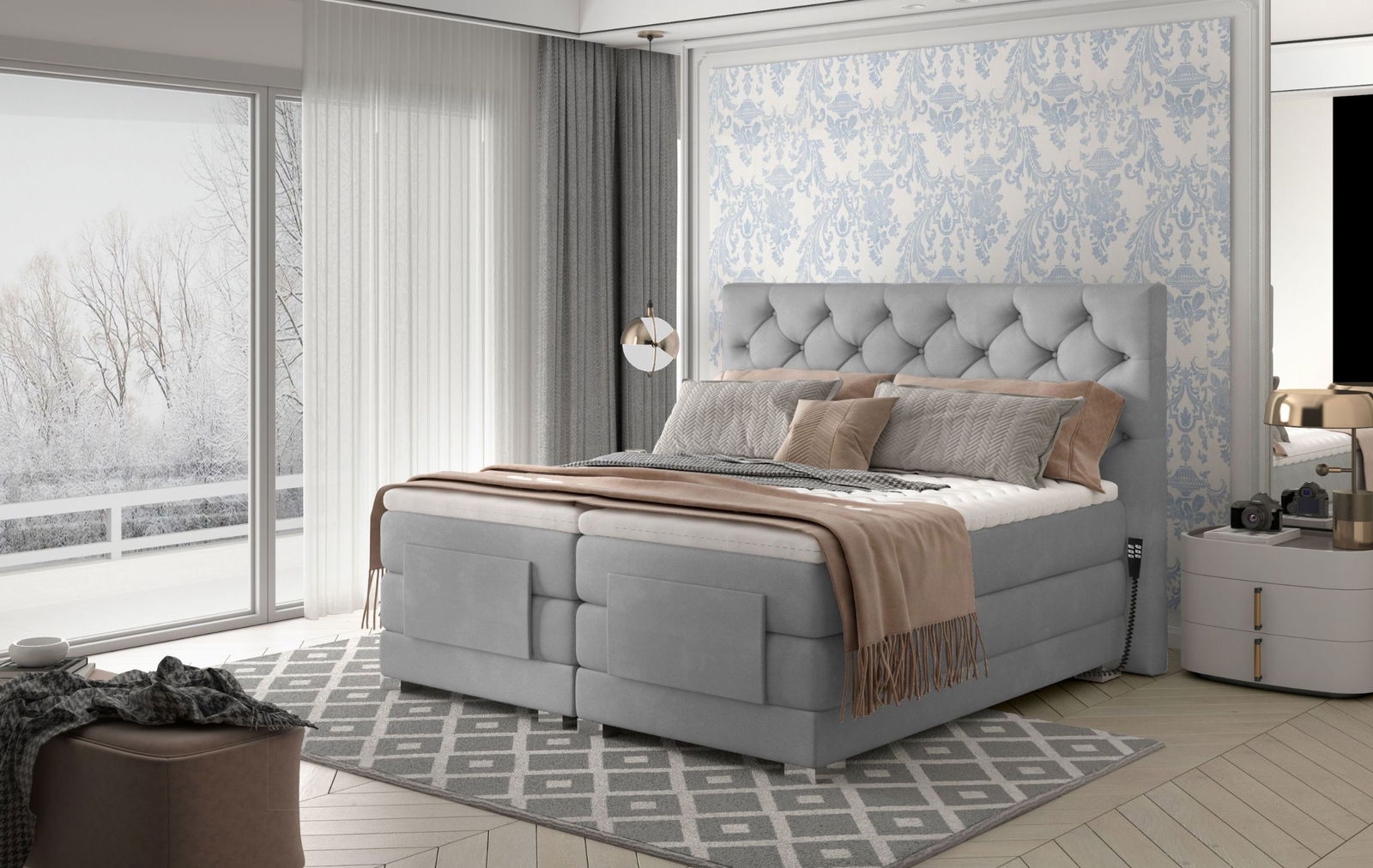 Επενδυμένο κρεβάτι Clover με στρώμα και ανώστρωμα μοντέρνου και πρακτικού σχεδιασμού, ιδανικό για στιγμές ξεκούρασης και χαλάρωσης. Καπιτόνε σχεδιασμός στο κεφαλάρι. Τα στρώματα ελέγχονται από 2 τηλεχειριστήρια που βρίσκονται και στις δύο πλευρές του κρεβατιού