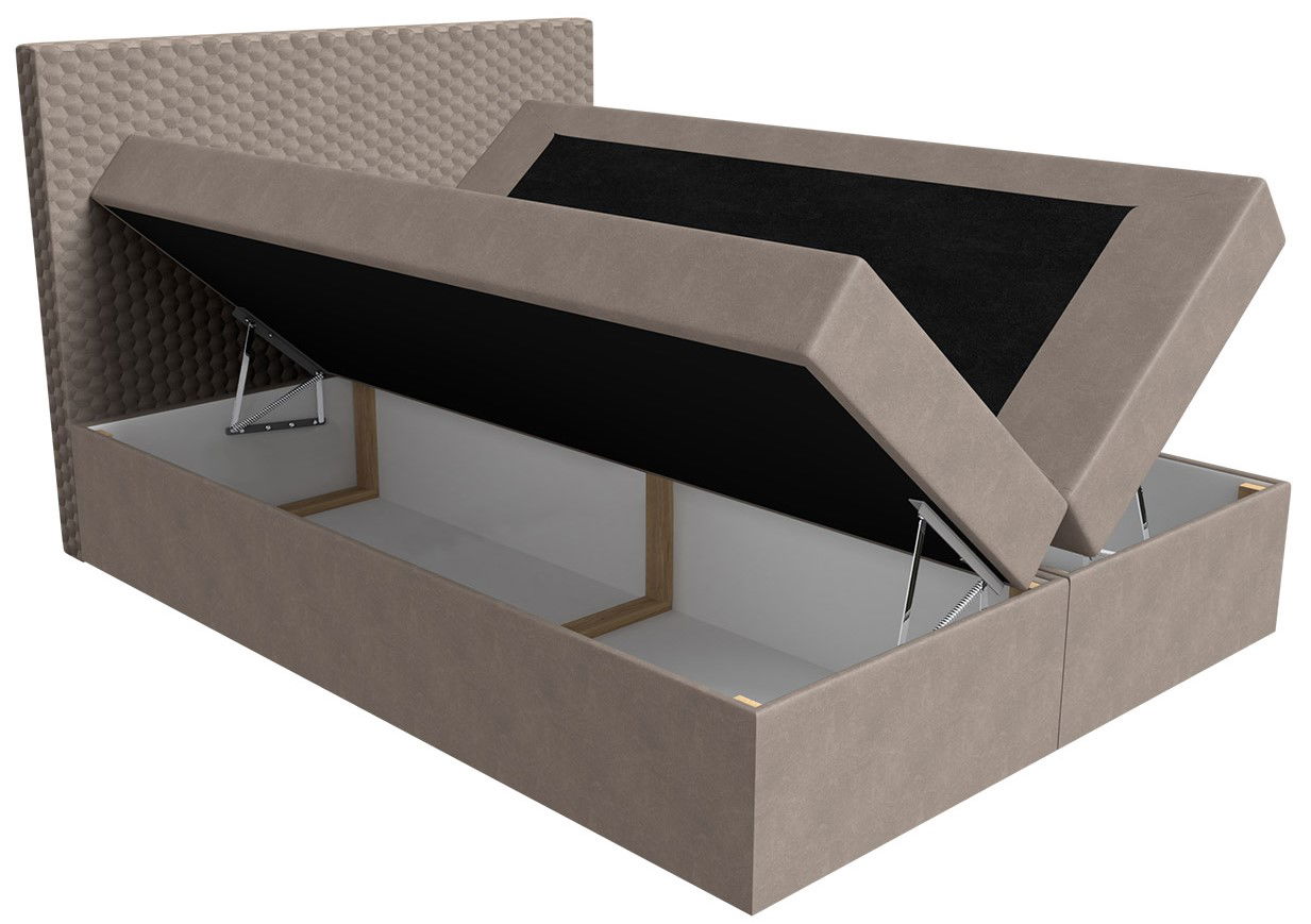 Το κρεβάτι Cosmo είναι επεμδυμένο με ύφασμα βελούδινης υφής ενώ στο προσκέφαλό του αποτυπώνεται ένα διακριτικό, κυψελωτό μοτίβο. Παράλληλα με το μοντέρνο σχεδιασμό του, διαθέτει αναπαυτικό στρώμα, καθώς και διπλό αποθηκευτικό χώρο για να σας διευκολύνει στην οργάνωση και τακτοποίηση του χώρου σας.