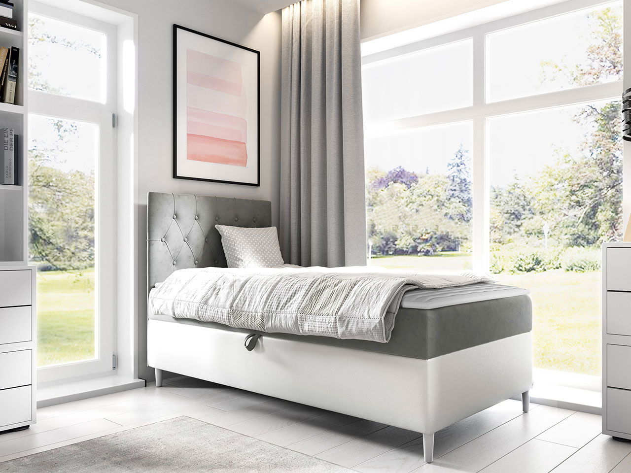 Επενδυμένο κρεβάτι Junior Filip I, σε πρακτικές διαστάσεις και έξυπνο σχεδιασμό ιδανικό για το παιδικό δωμάτιο.