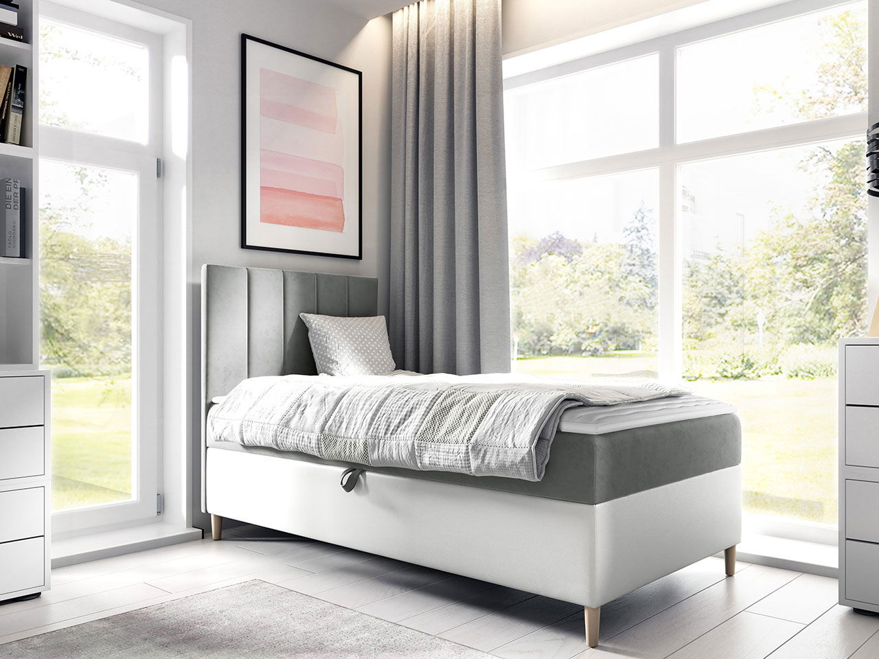 Επενδυμένο κρεβάτι Junior Maja I, σε πρακτικές διαστάσεις και έξυπνο σχεδιασμό ιδανικό για το παιδικό δωμάτιο.