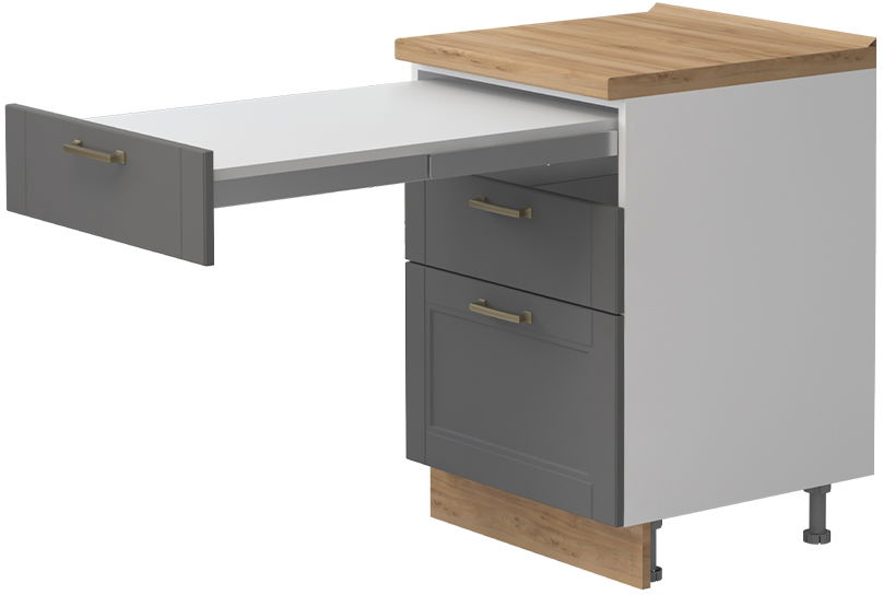 Επιδαπέδιο ντουλάπι Tahoma R-60-3FMS με επεκτεινόμενο τραπέζι, η ιδανική λύση για την αποθήκευση σκευών μαγειρικής και μικροαντικειμένων στον χώρο της κουζίνας. Συνδυάστε με τα υπόλοιπα έπιπλα της σειράς κουζίνας Tahoma, για να δημιουργήσετε την ιδανική κουζίνας στα μέτρα σας.