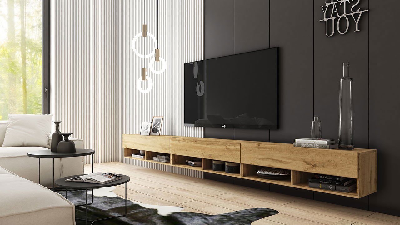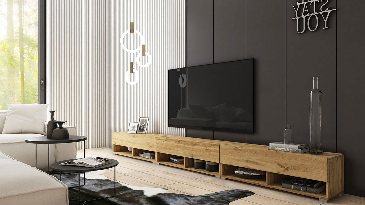 Έπιπλο τηλεόρασης A 300 μοντέρνου σχεδιασμού με πρακτικούς χώρους για αποθηκευση αντικειμένων.