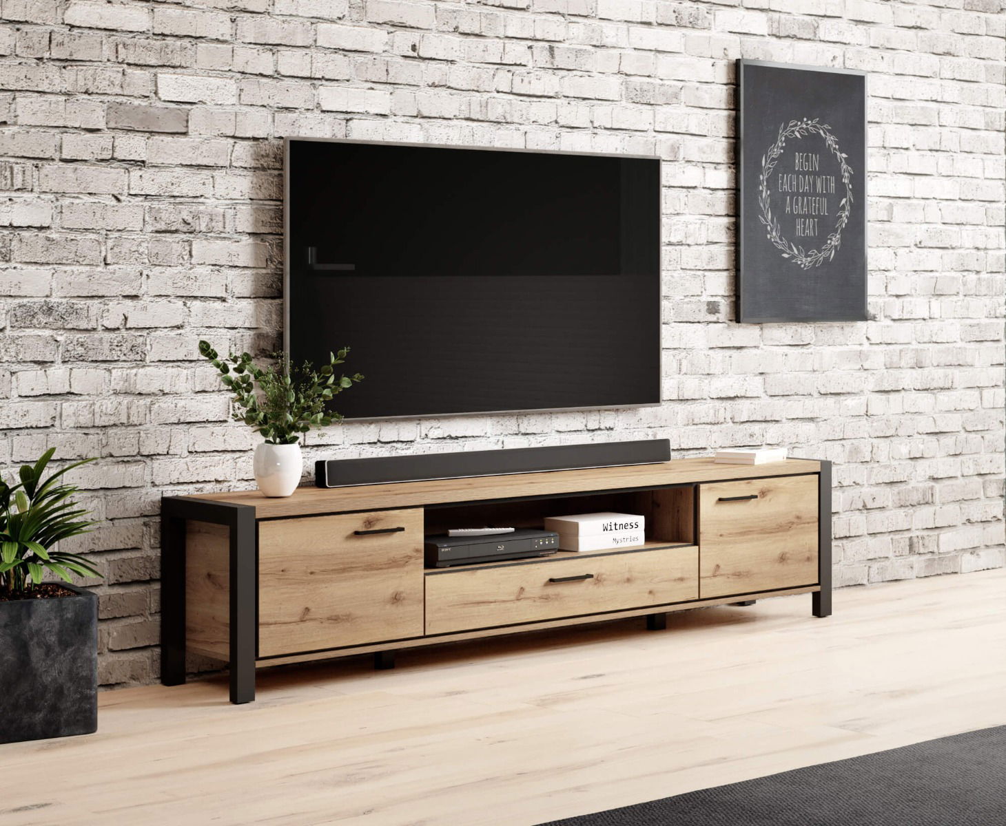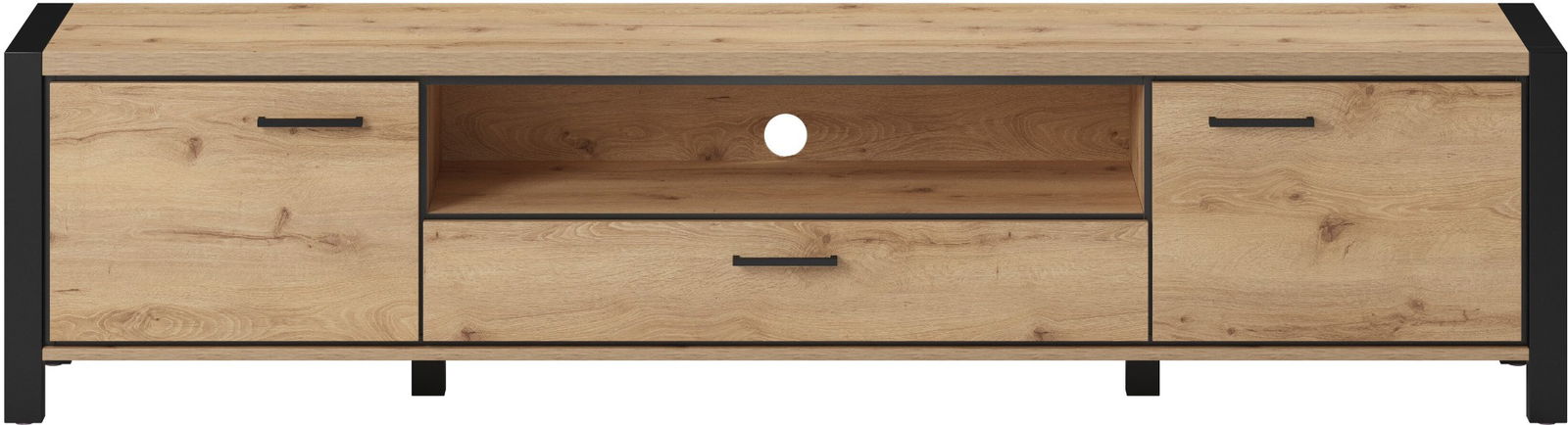 Έπιπλο τηλεόρασης Amelie σε μοντέρνο, industrial σχεδιασμό. Είναι σίγουρο πως θα ανανεώσετε τον χώρο σας, προσδίδοντας του μια κομψή νότα, χάρις τις μαύρες λεπτομέρειες. Διαθέτει πρακτικές διαστάσεις και ευρύχωρο αποθηκευτικό χώρο που το καθιστούν ιδανική επιλογή για κάθε σαλόνι.