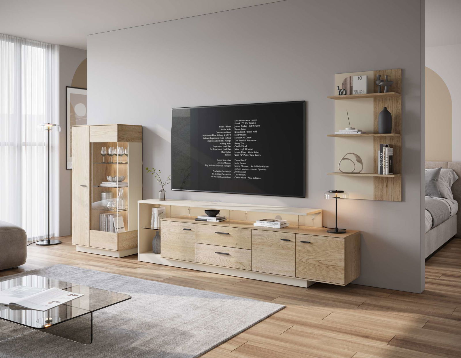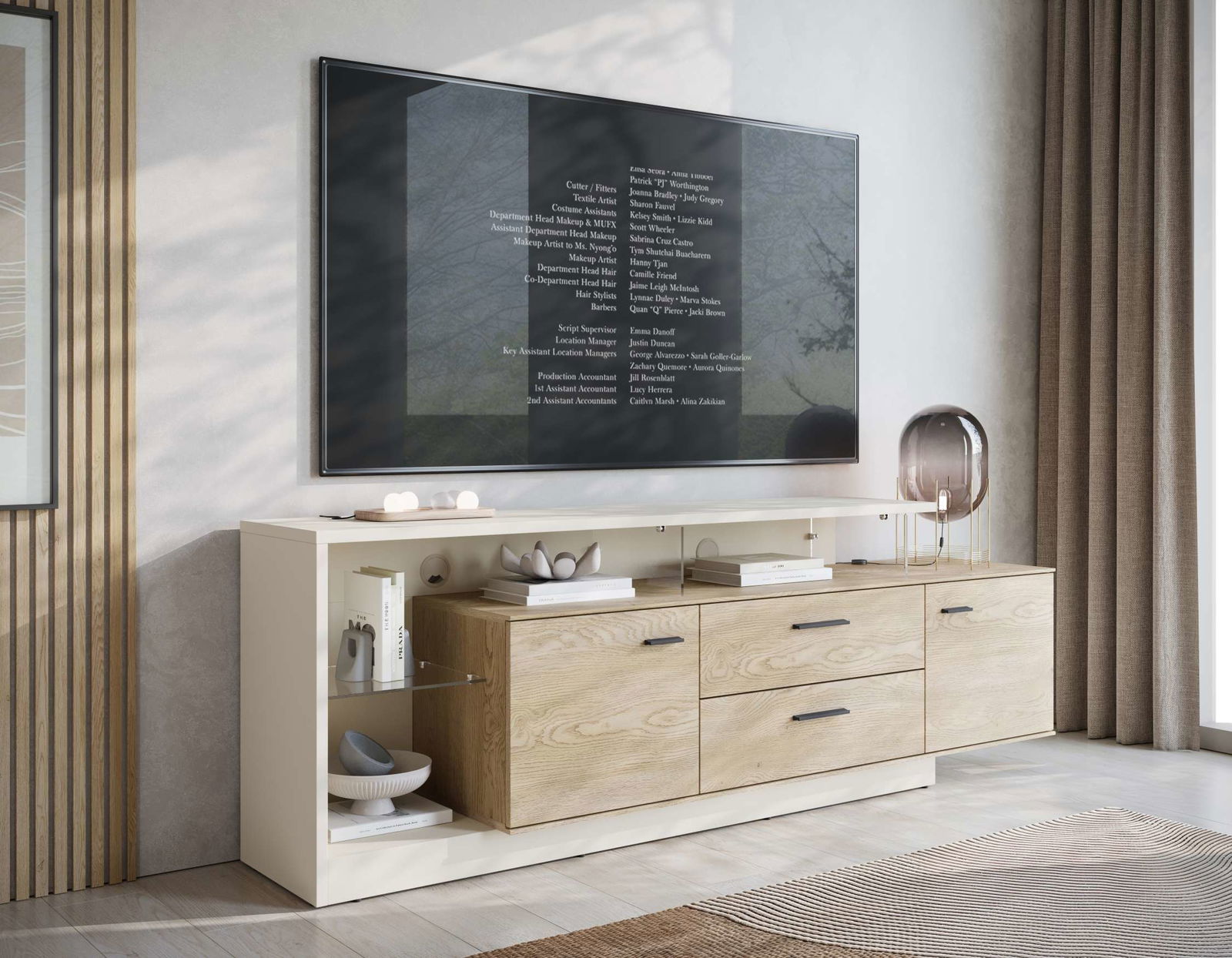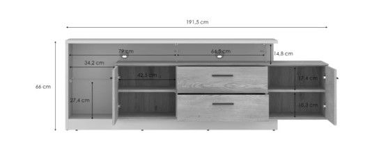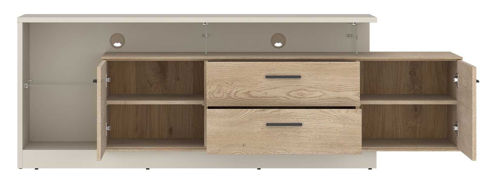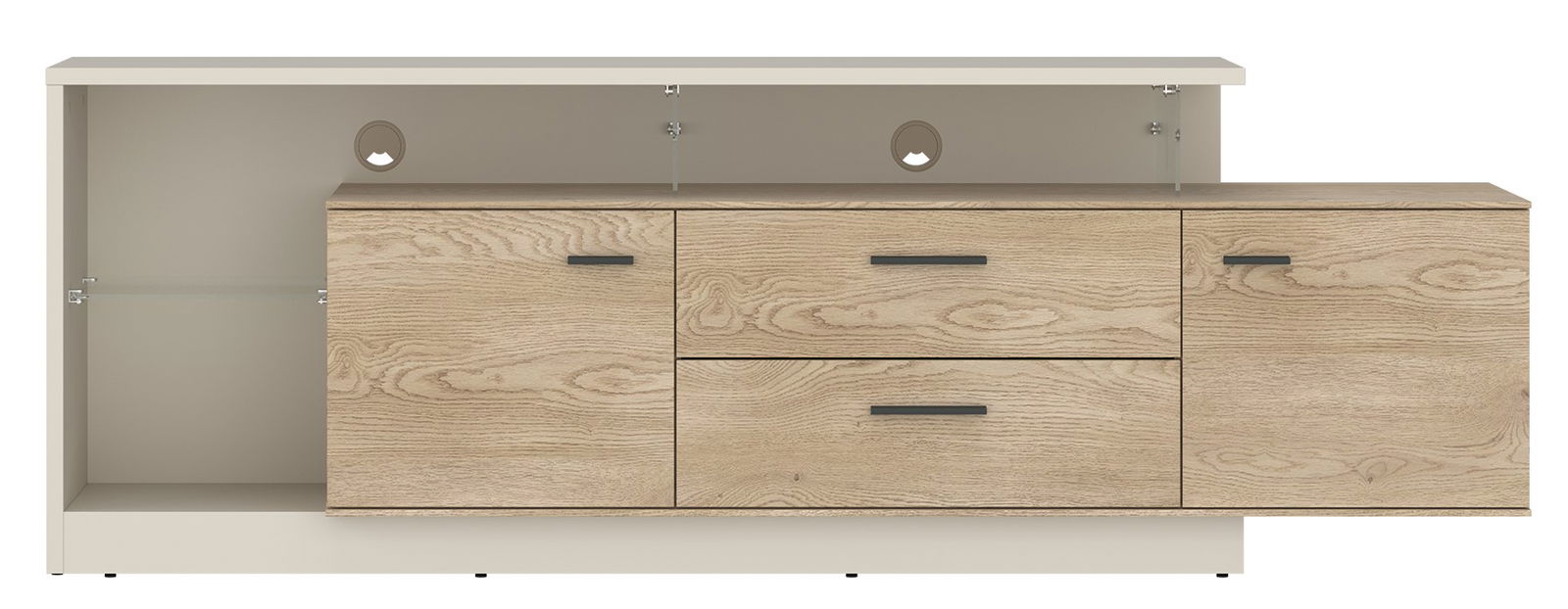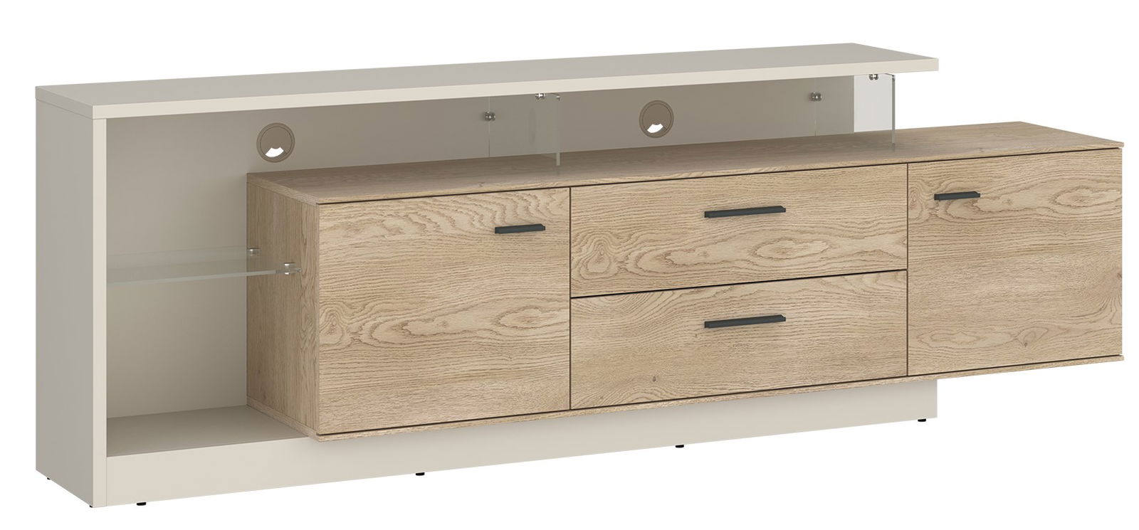 Σύγχρονο έπιπλο τηλεόρασης Angolo με συνδυασμό φυσικής όψης ξύλου και απαλού cashmere. Διαθέτει δύο πόρτες, δύο ευρύχωρα συρτάρια και ανοιχτό αποθηκευτικό χώρο με οπές για καλώδια. Ιδανικό για οργάνωση και κομψή αισθητική στο σαλόνι σας. Συνδυάστε το, με τα υπόλοιπα έπιπλα της ίδιας σειράς.