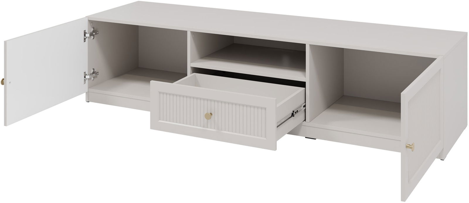 Το έπιπλο τηλεόρασης Ferena συνδυάζει μοντέρνο σχεδιασμό με πρακτικότητα. Οι απαλές αποχρώσεις και οι διακριτικές αυλακώσεις προσθέτουν κομψότητα στον χώρο, ενώ τα στρογγυλά πόμολα και οι διακριτικές λαβές ολοκληρώνουν το εκλεπτυσμένο στυλ.