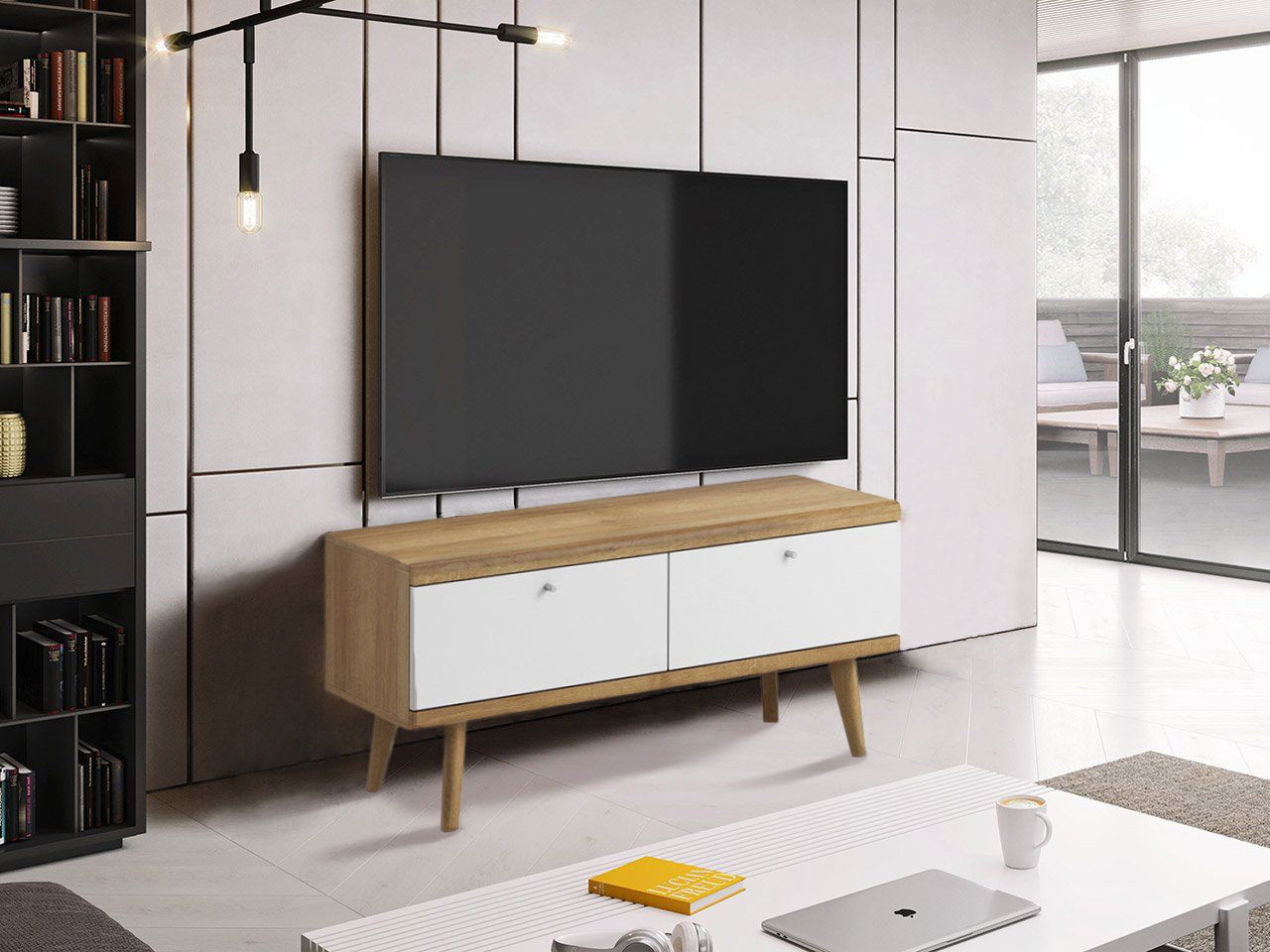 Βάση τηλεόρασης Gusto λιτού και μοντέρνου σχεδιασμού, σε όμορφη διχρωμία λευκού με φυσικού