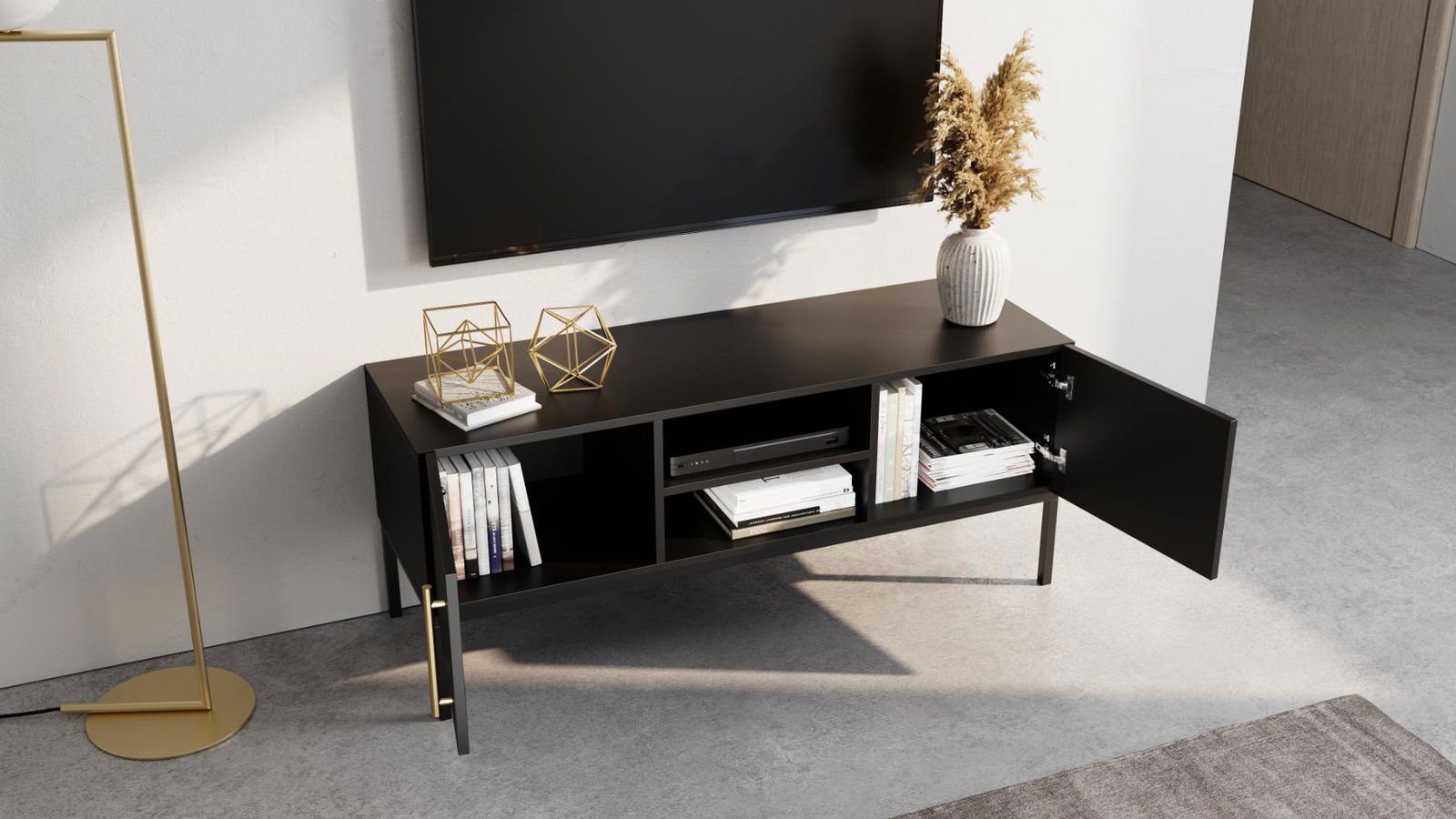 Έπιπλο τηλεόρασης Lazzy μίνιμαλ σχεδιασμού με πρακτικούς αποθηκευτικούς χώρους και μοντέρνα διχρωμία. Συνδυάστε το με τα υπόλοιπα έπιπλα της ίδιας σειράς για ενα ομοιόμορφο αποτέλεσμα.