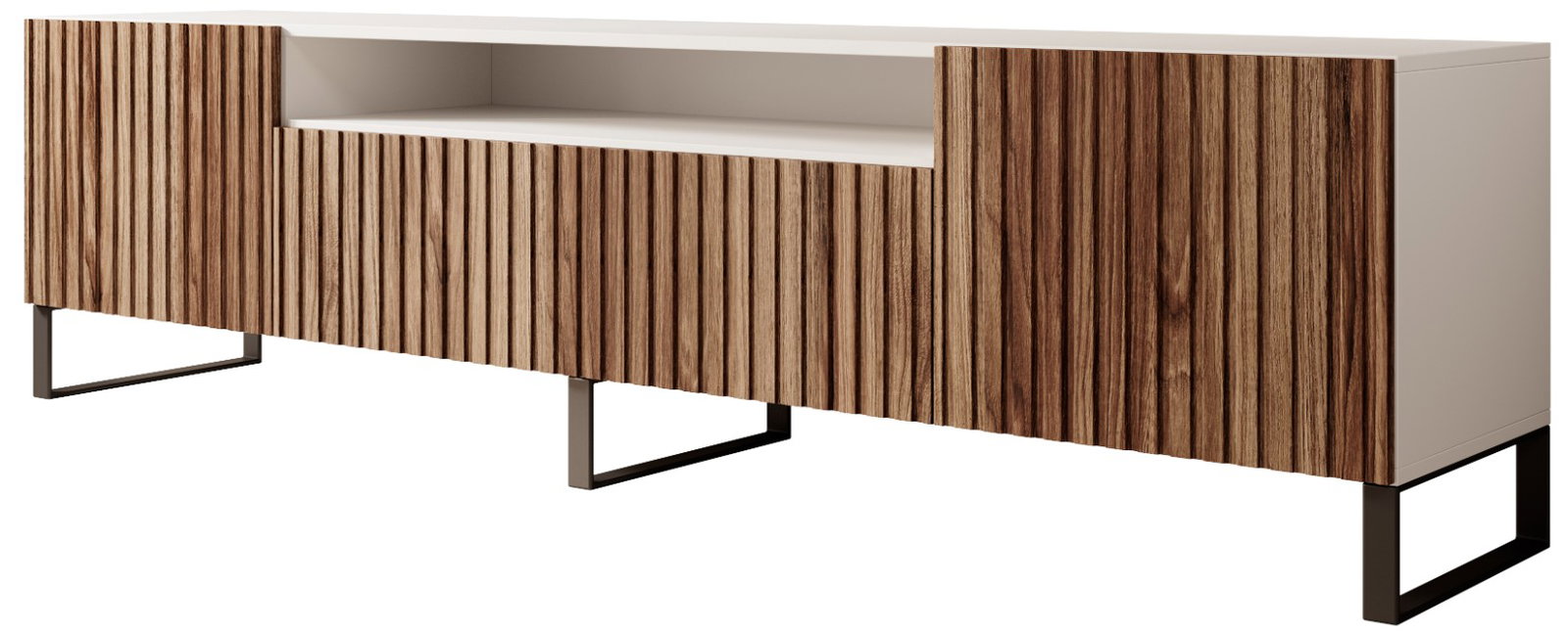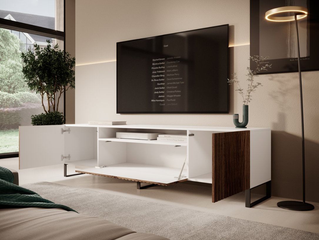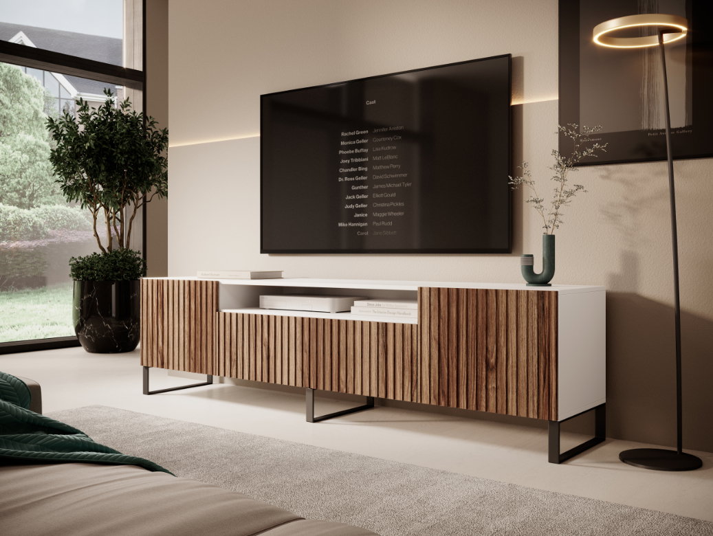 Το κομψό και λειτουργικό έπιπλο τηλεόρασης Miram I συνδυάζει μοντέρνο σχεδιασμό με μια πινελιά φυσικής ομορφιάς. Το μοναδικό σχέδιο με τις κάθετες ανάγλυφες πλάκες ξύλου προσθέτει μια ζεστή και φιλόξενη πινελιά στο σαλόνι σας.