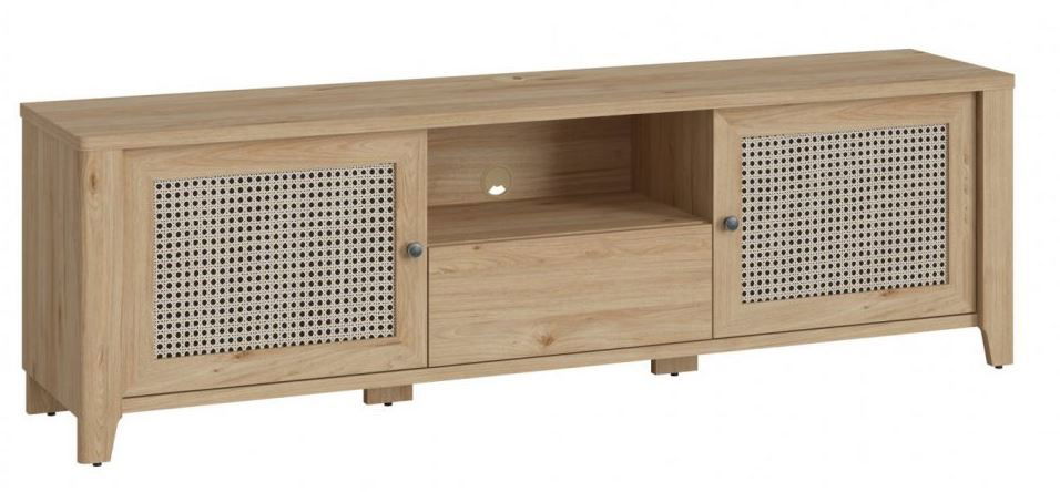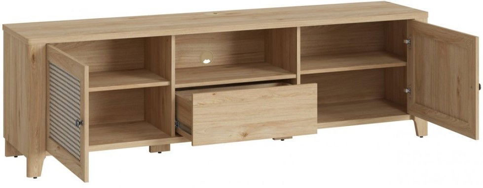 Το έπιπλο τηλεόρασης Nostice αποτελεί την κατάλληλη επιλογή για το καθιστικό σας. Αυτό το μοναδικό έπιπλο περιέχει μια μοντέρνα λύση με συρόμενη πρόσοψη. Εσείς αποφασίζετε ποιο χώρο θα εκθέσετε. Πάνω από το συρτάρι, υπάρχει ένα πρακτικό ανοιχτό ράφι και μια τρύπα καλωδίωσης, ενσωματωμένα στο πίσω μέρος του επίπλου.