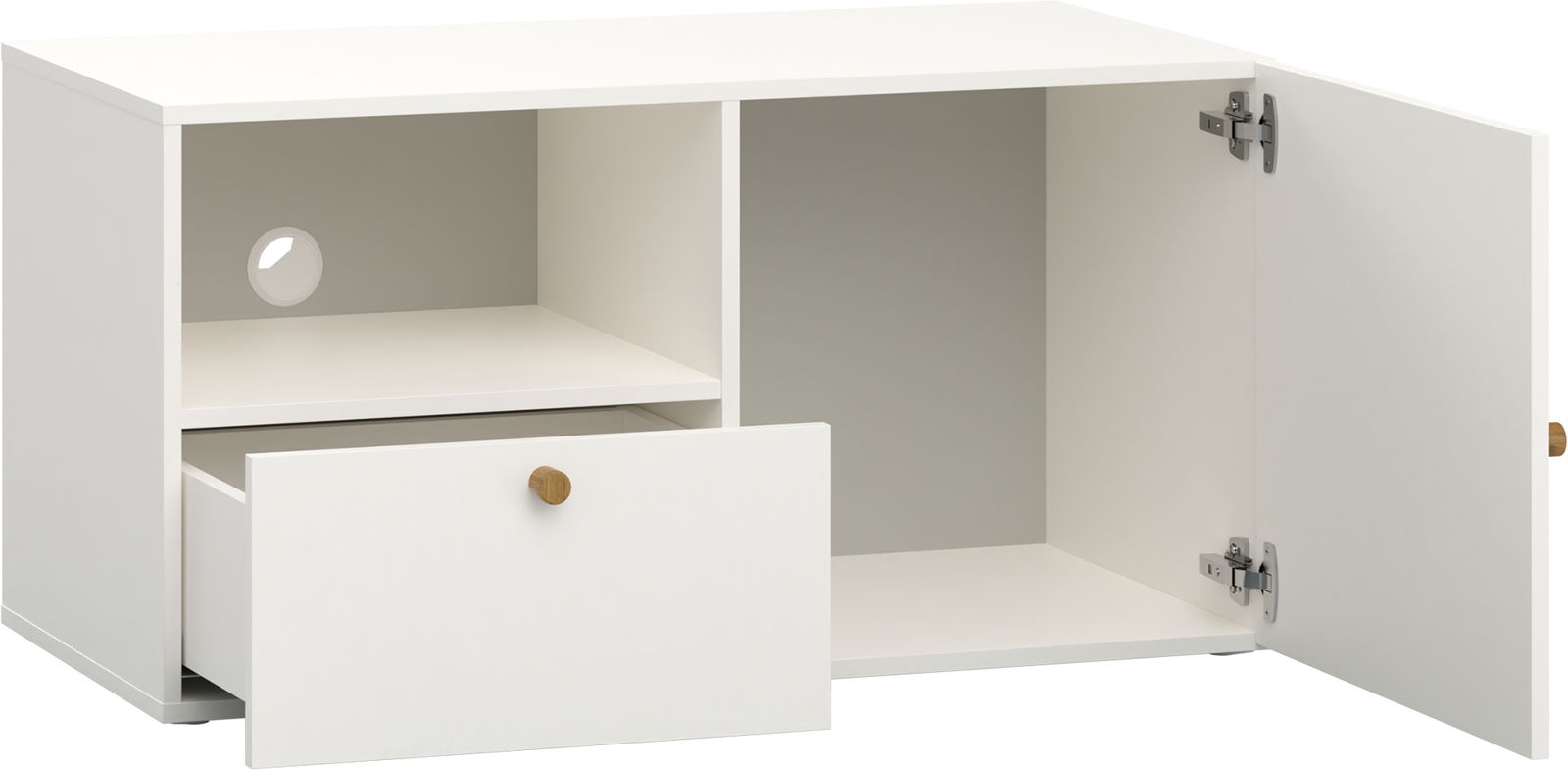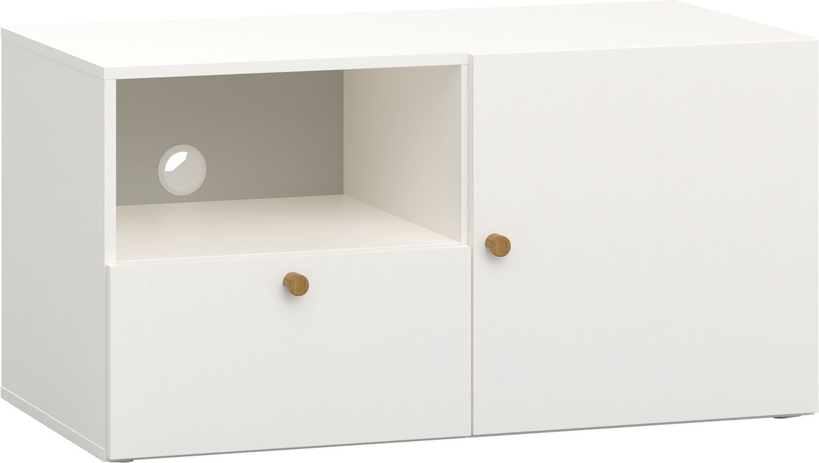 Tο Έπιπλο τηλεόρασης Reli mini είναι ιδανικό για στενούς χώρους. Μπορείτε να τοποθετήσετε την τηλεόραση σε ύψος που είναι στο επίπεδο των ματιών σας, εξασφαλίζοντας άνεση κατά την παρακολούθηση και το παιχνίδι. Πρακτικά ράφια και συρτάρια θα σας βοηθήσουν να διατηρείτε τον εξοπλισμό και τα καλώδια σας σε τάξη