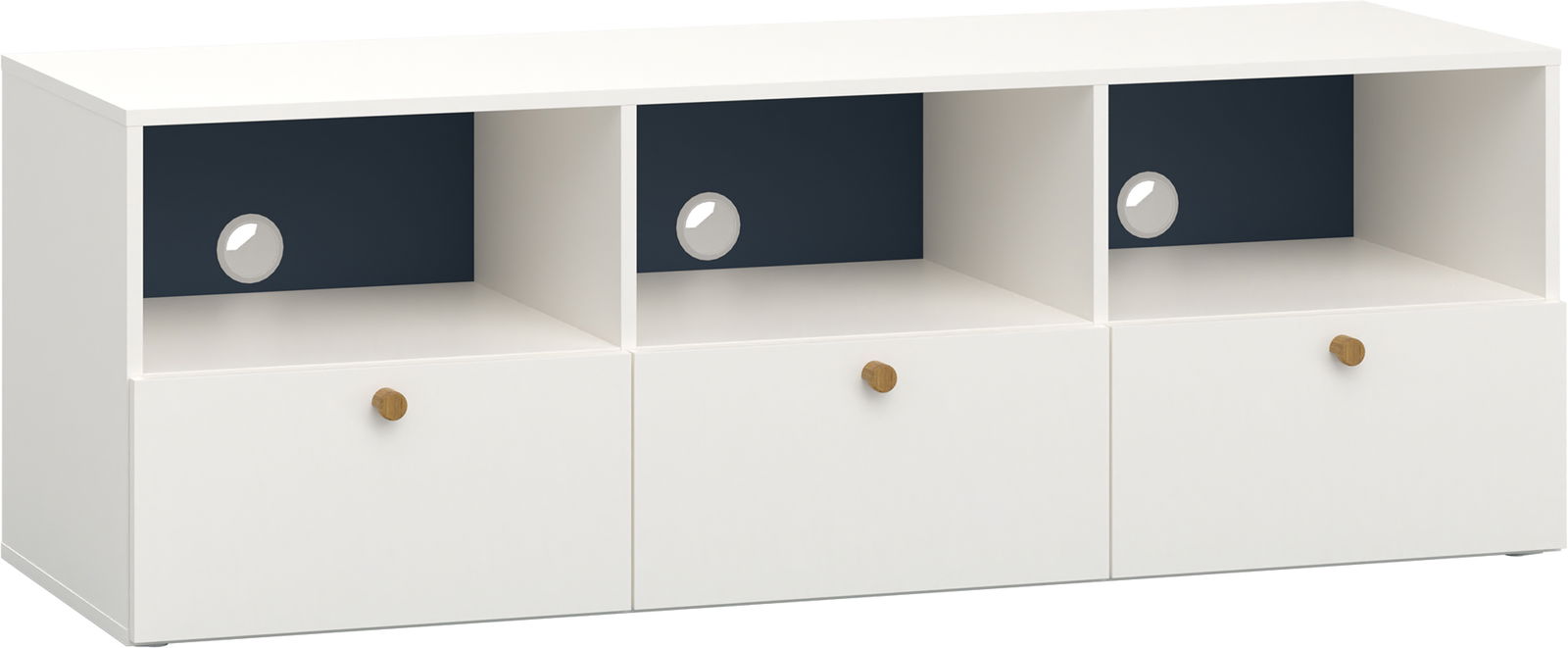 – Διαθέτει τρία συρτάρια και τρεις ανοιχτούς χώρους με οπές για καλώδια