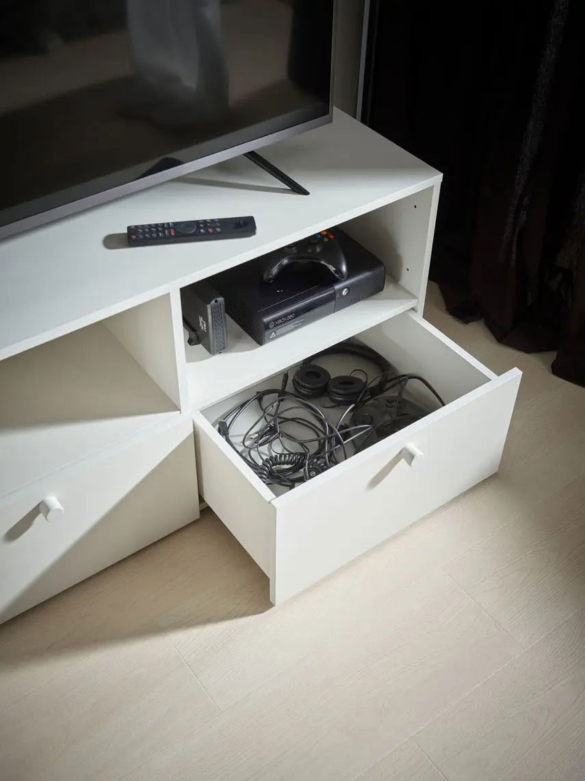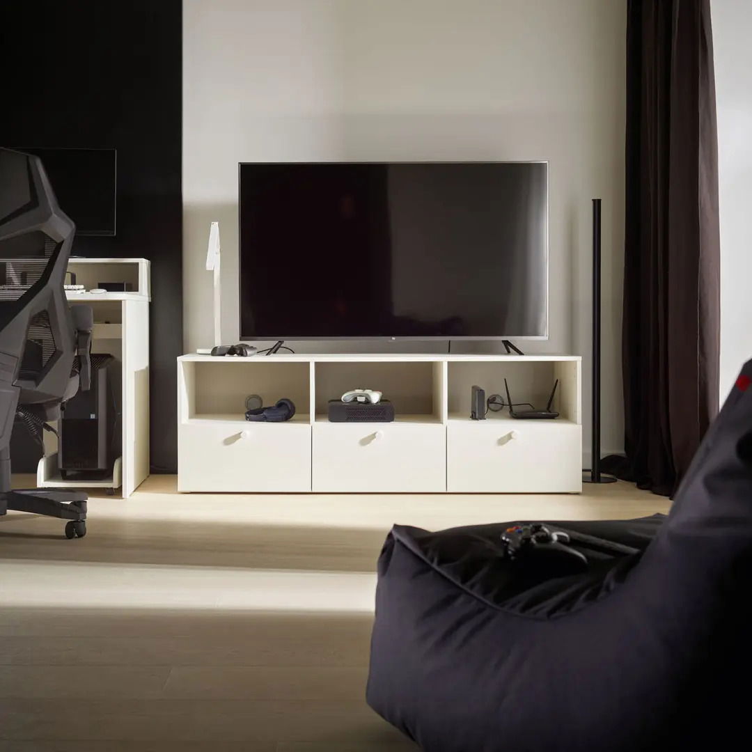 Στο Έπιπλο τηλεόρασης Reli, μπορείτε να τοποθετήσετε την τηλεόραση σε ύψος που είναι στο επίπεδο των ματιών σας, εξασφαλίζοντας άνεση κατά την παρακολούθηση και το παιχνίδι. Πρακτικά ράφια και συρτάρια θα σας βοηθήσουν να διατηρείτε τον εξοπλισμό και τα καλώδια σας σε τάξη