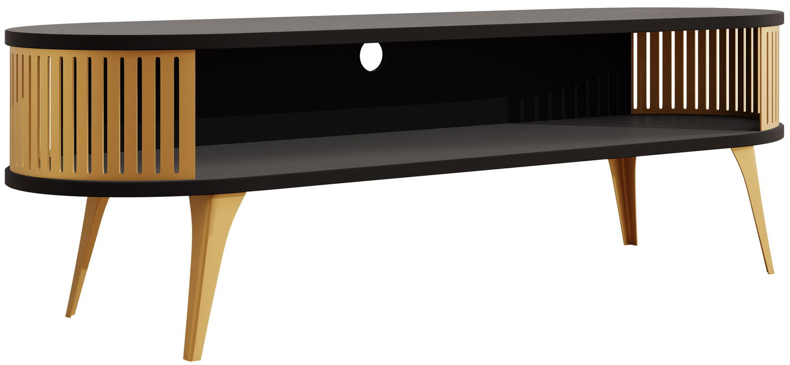Το λαμπερό έπιπλο τηλεόρασης Roenni GD είναι ένα statement κομμάτι για κάθε μοντέρνο σαλόνι. Η κομψή επιφάνεια έρχεται σε υπέροχη αντίθεση με τις ζεστές χρυσές πινελιές, δημιουργώντας μια εκλεπτυσμένη και κομψή εμφάνιση. Ο μοναδικός σχεδιασμός με τα κάθετα πηχάκια προσθέτει μια πινελιά οπτικού ενδιαφέροντος.