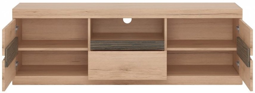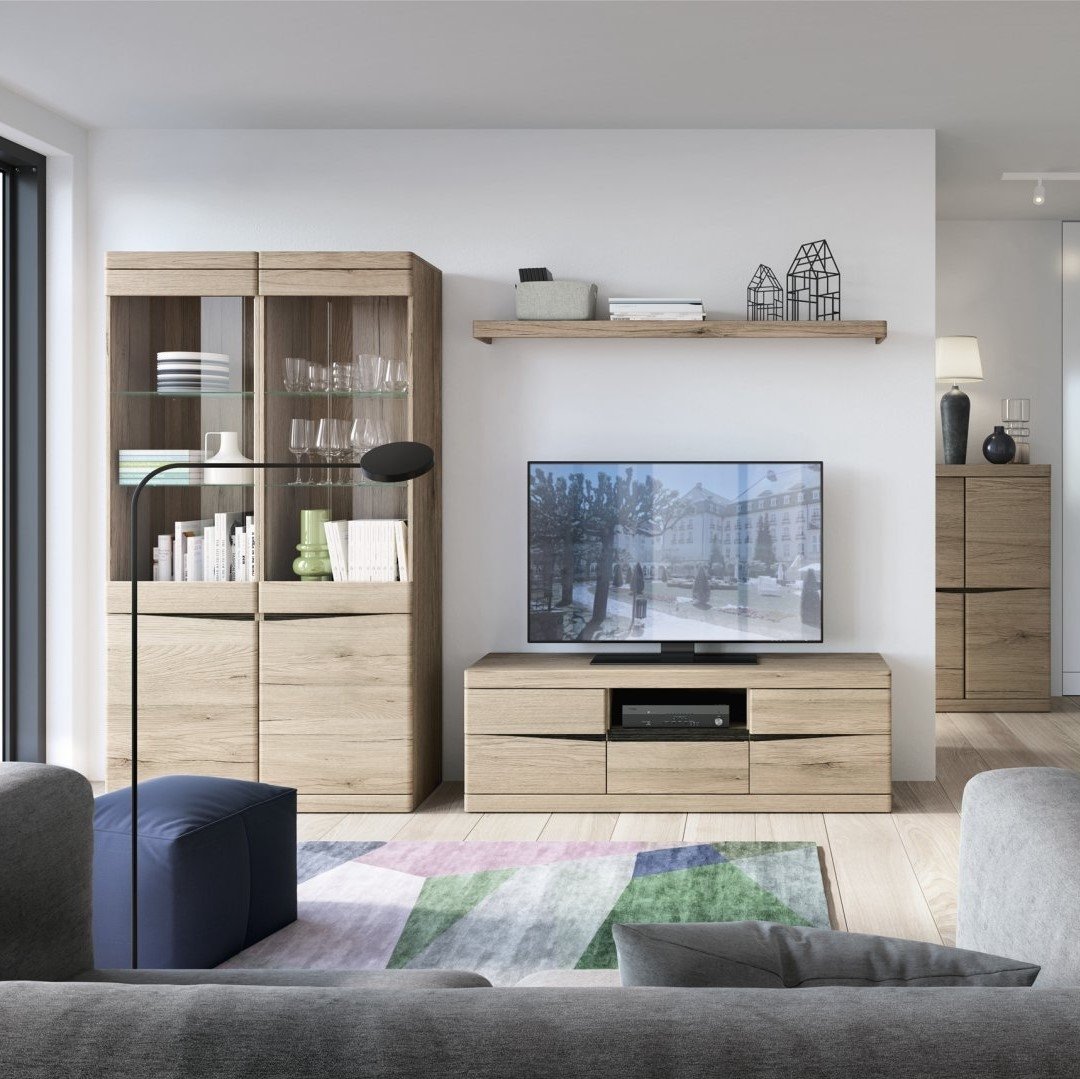 Κομψή βάση τηλεόρασης σε απόχρωση φυσικού ξύλου που θα φωτίσει το καθιστικό και θα σας προσφέρει πρακτικούς αποθηκευτικούς χώρους! Χαρακτηριστική λεπτομέρεια της σειράς Santiago αποτελούν τα σκαλιστά σχέδια σε βέγγε χρώμα που χρησιμεύουν και σαν λαβές.