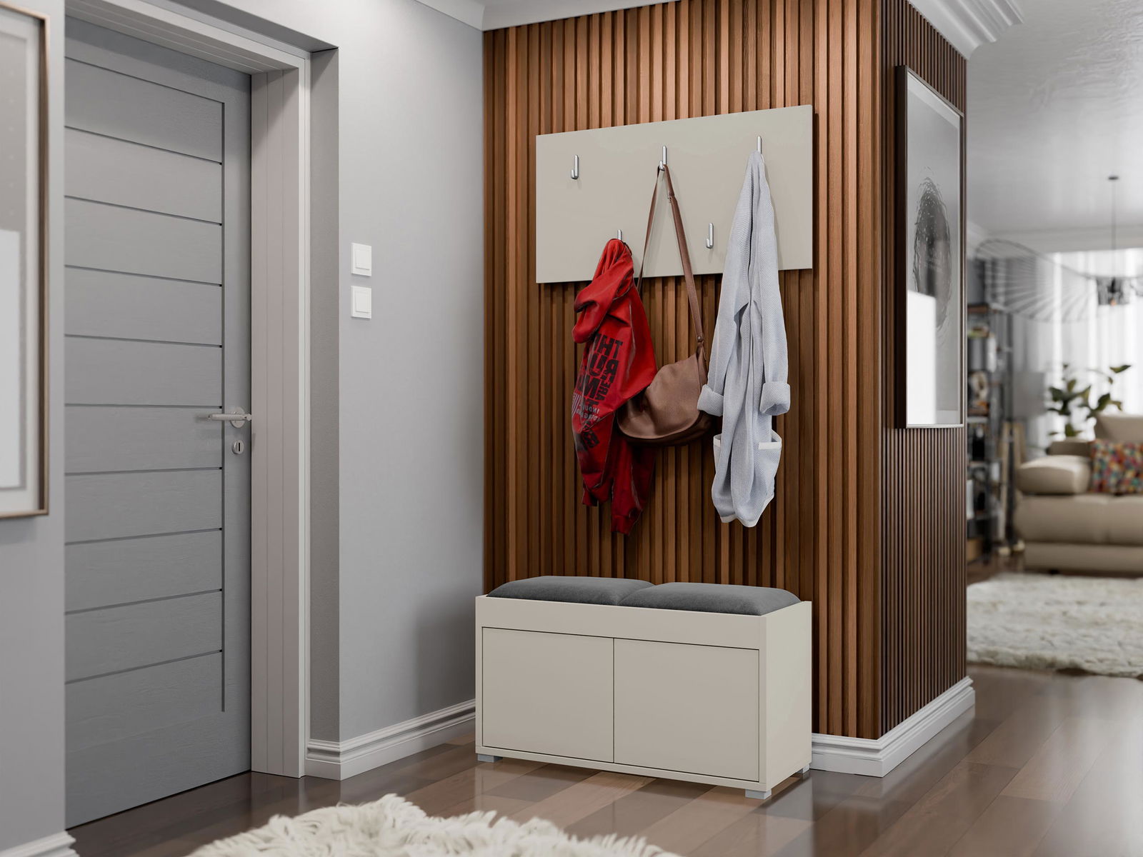 Το λειτουργικό έπιπλο εισόδου Gesita είναι η τέλεια λύση για να διατηρήσετε το σπίτι σας οργανωμένο και φιλόξενο. Η επιτοίχια κρεμάστρα παρέχει άφθονο χώρο για να κρεμάσετε παλτά, σακάκια και τσάντες, ενώ το σκαμπό με αποθηκευτικό χώρο προσφέρει ένα μέρος για να καθίσετε και να βγάλετε τα παπούτσια σας.