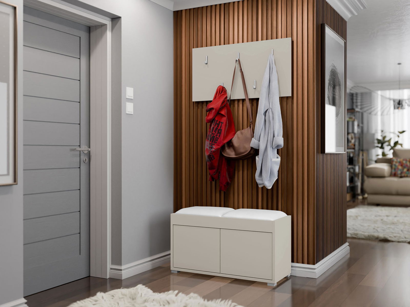 Το λειτουργικό έπιπλο εισόδου Gesita είναι η τέλεια λύση για να διατηρήσετε το σπίτι σας οργανωμένο και φιλόξενο. Η επιτοίχια κρεμάστρα παρέχει άφθονο χώρο για να κρεμάσετε παλτά, σακάκια και τσάντες, ενώ το σκαμπό με αποθηκευτικό χώρο προσφέρει ένα μέρος για να καθίσετε και να βγάλετε τα παπούτσια σας.