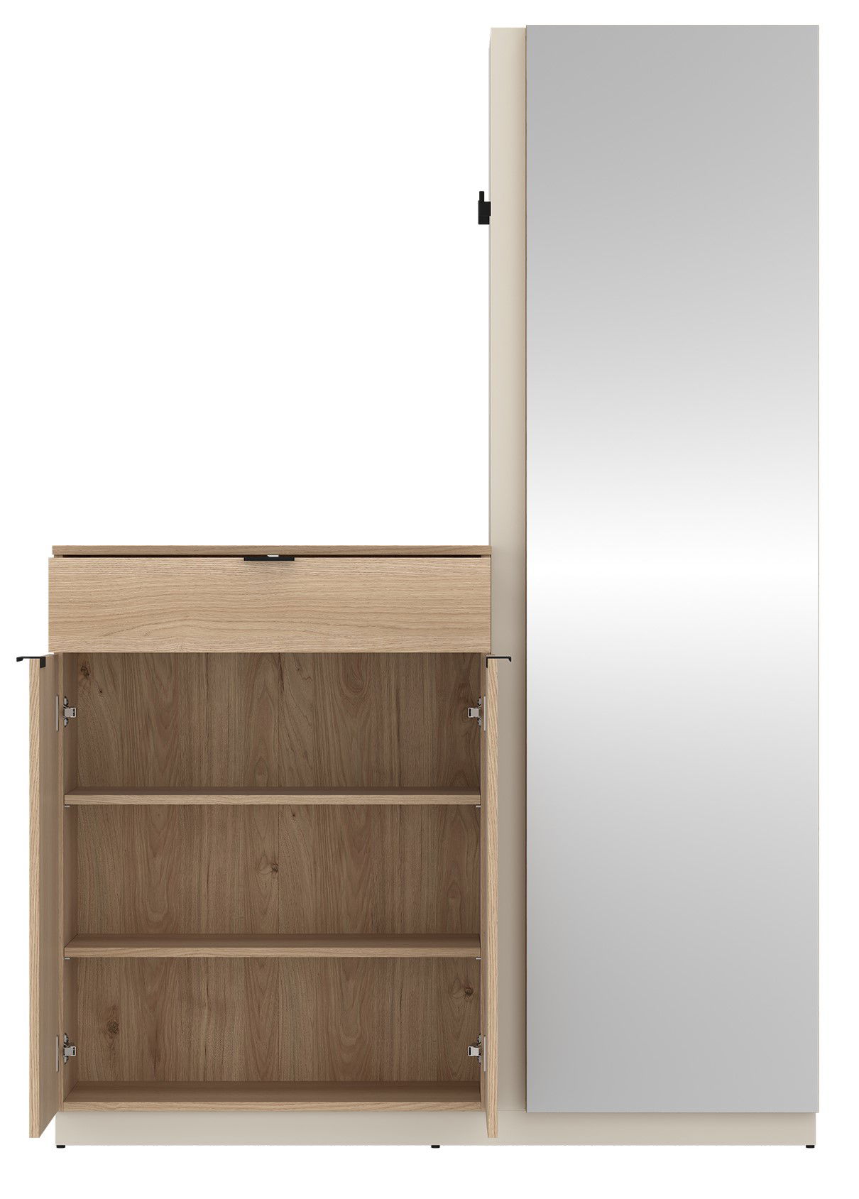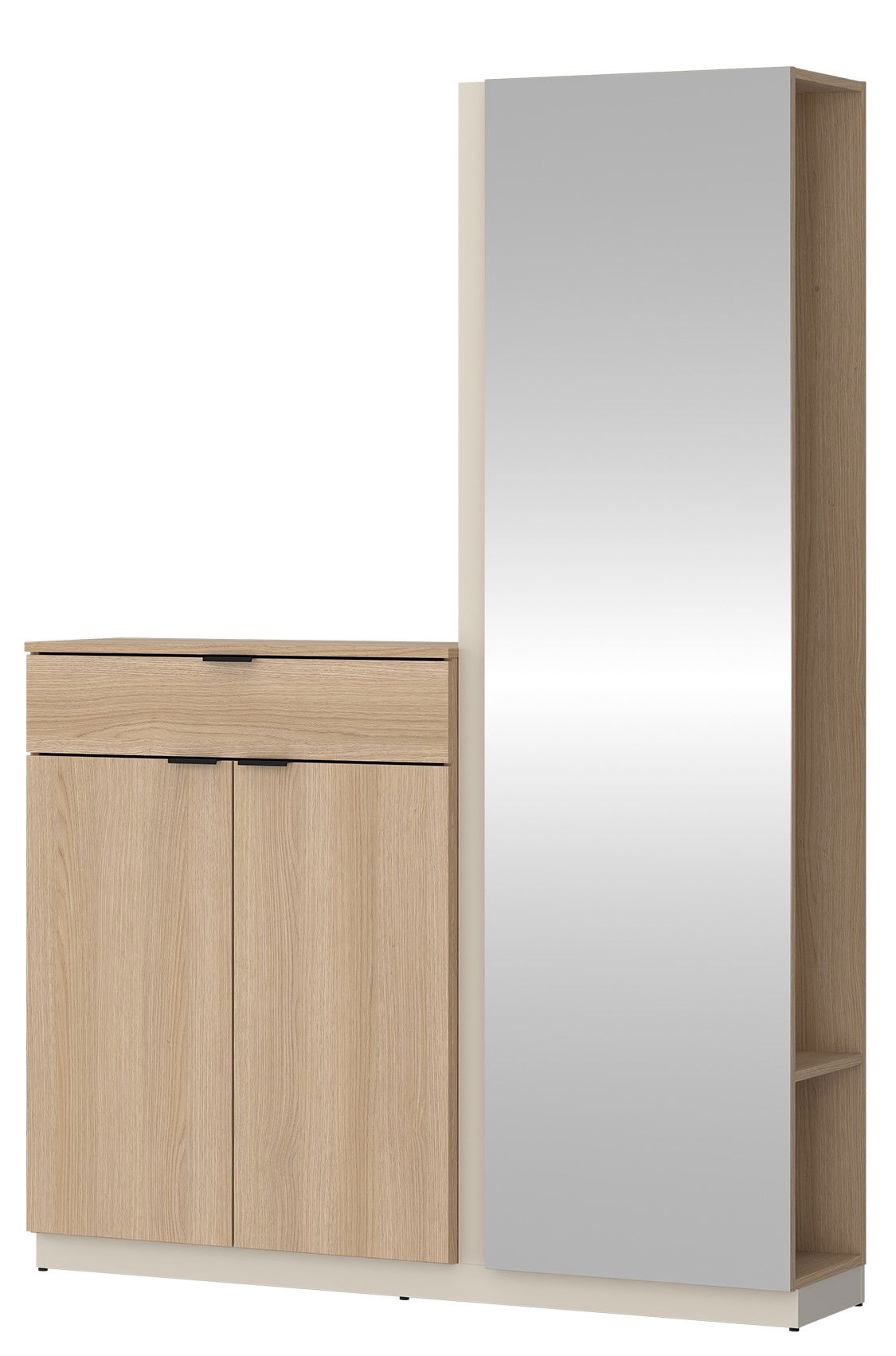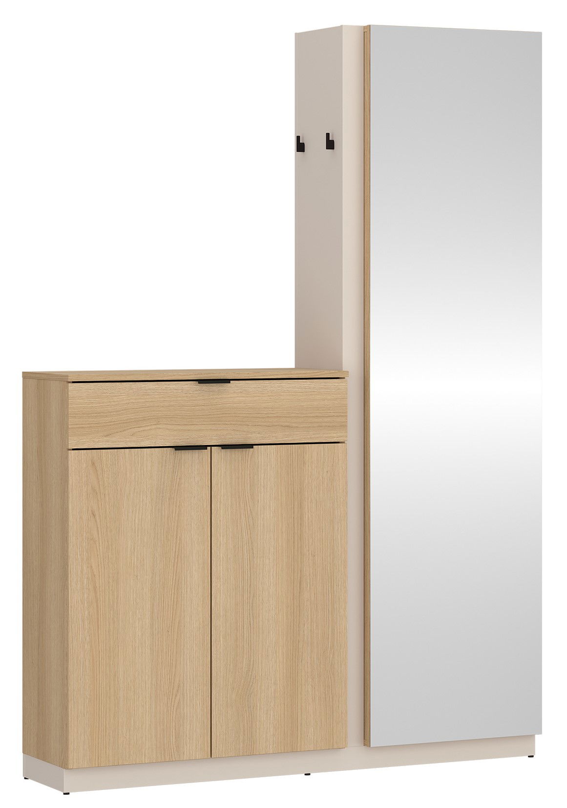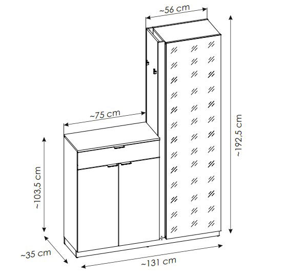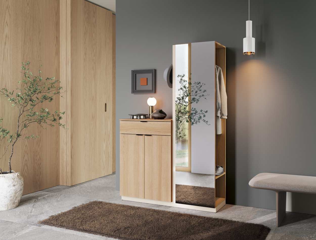 Μοντέρνο και λειτουργικό έπιπλο εισόδου με φυσική όψη ξύλου, ιδανικό για κάθε χώρο. Διαθέτει ντουλάπια αποθήκευσης, συρτάρι για μικροαντικείμενα, κρεμάστρες και μεγάλο καθρέφτη πλήρους ύψους. Ιδανικό για οργάνωση και στυλ στην είσοδο του σπιτιού σας.