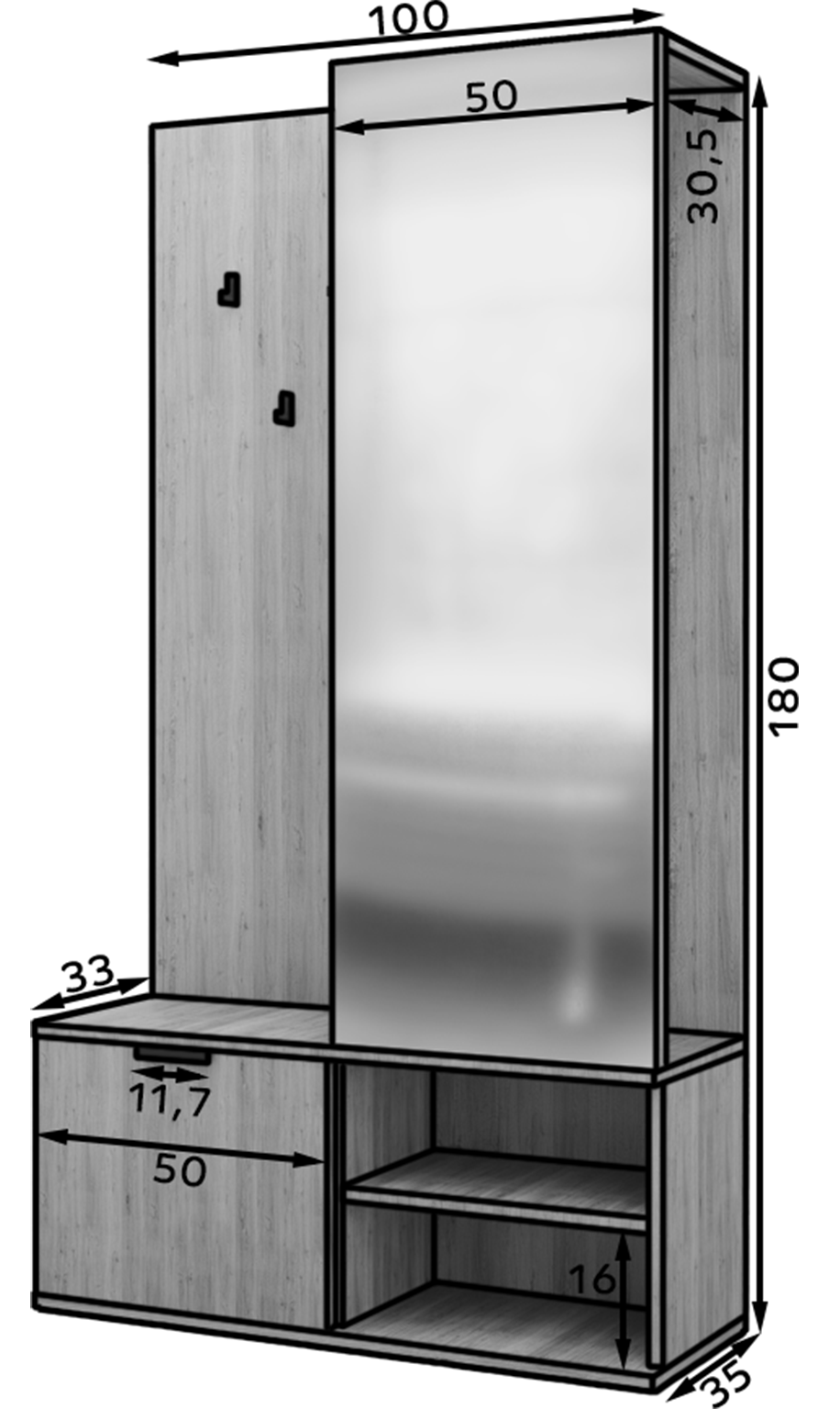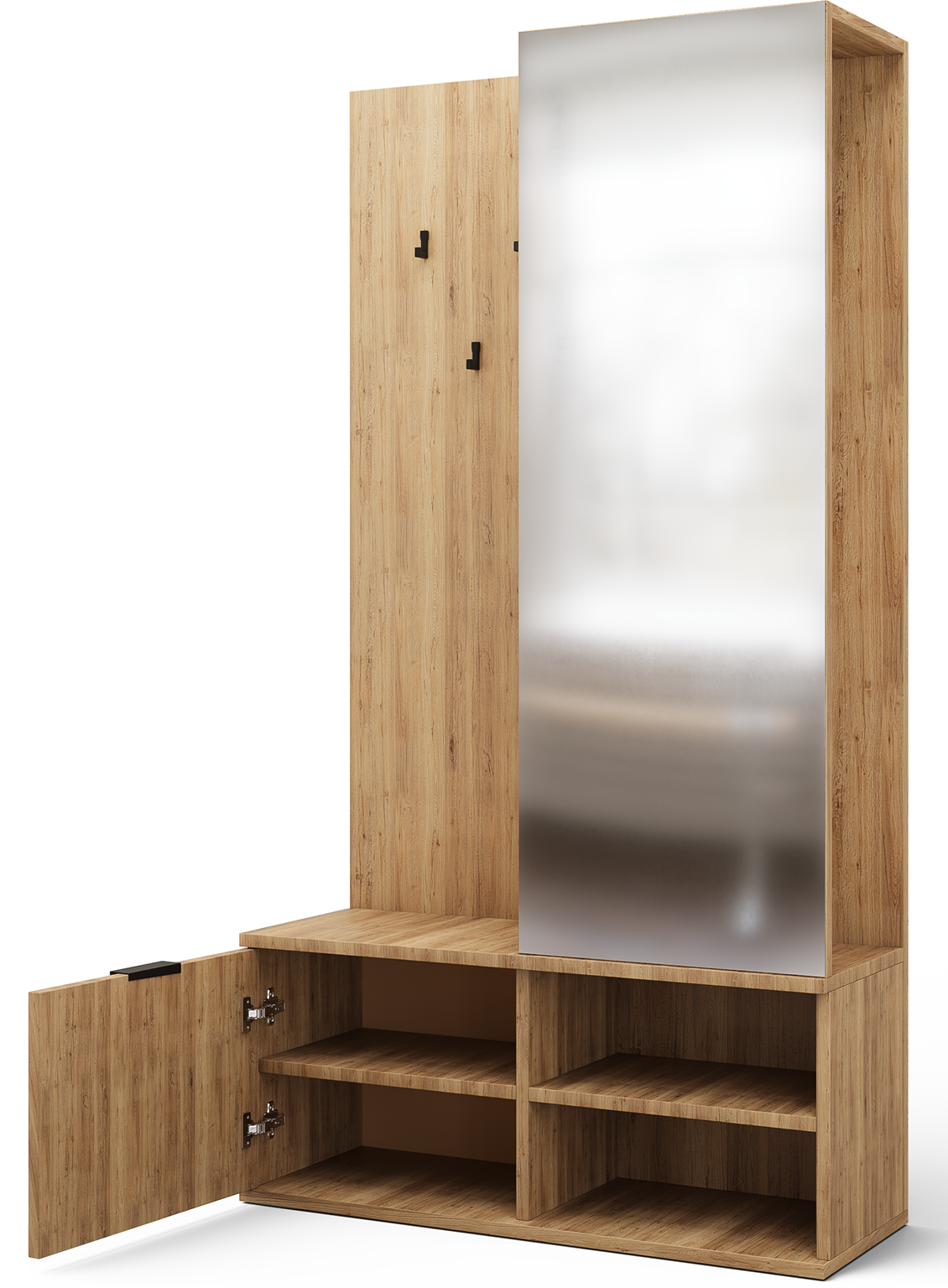 Ένα κομψό και λειτουργικό έπιπλο υποδοχής που συνδυάζει μοντέρνο design με πρακτικότητα. Διαθέτει ευρύχωρους αποθηκευτικούς χώρους για παπούτσια και αξεσουάρ, έναν μεγάλο καθρέφτη για γρήγορο έλεγχο πριν την έξοδο, καθώς και ανθεκτικούς γάντζους για την εύκολη τοποθέτηση παλτών και τσαντών.