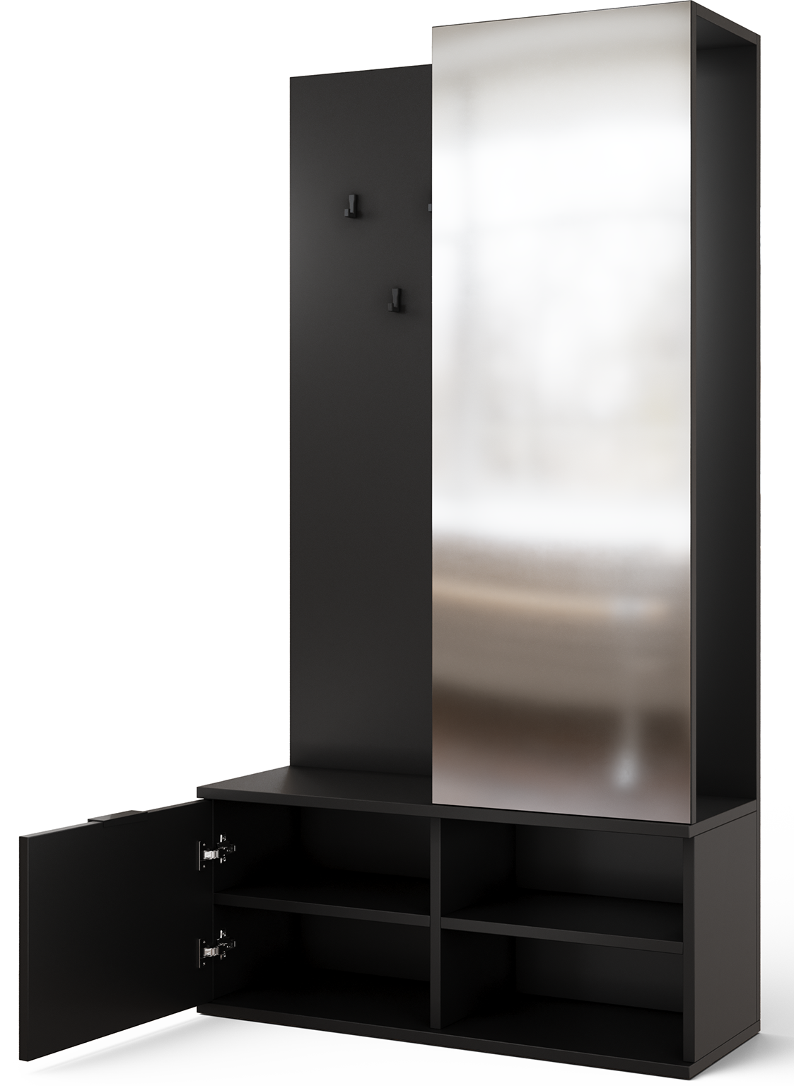 Ένα κομψό και λειτουργικό έπιπλο υποδοχής που συνδυάζει μοντέρνο design με πρακτικότητα. Διαθέτει ευρύχωρους αποθηκευτικούς χώρους για παπούτσια και αξεσουάρ, έναν μεγάλο καθρέφτη για γρήγορο έλεγχο πριν την έξοδο, καθώς και ανθεκτικούς γάντζους για την εύκολη τοποθέτηση παλτών και τσαντών.