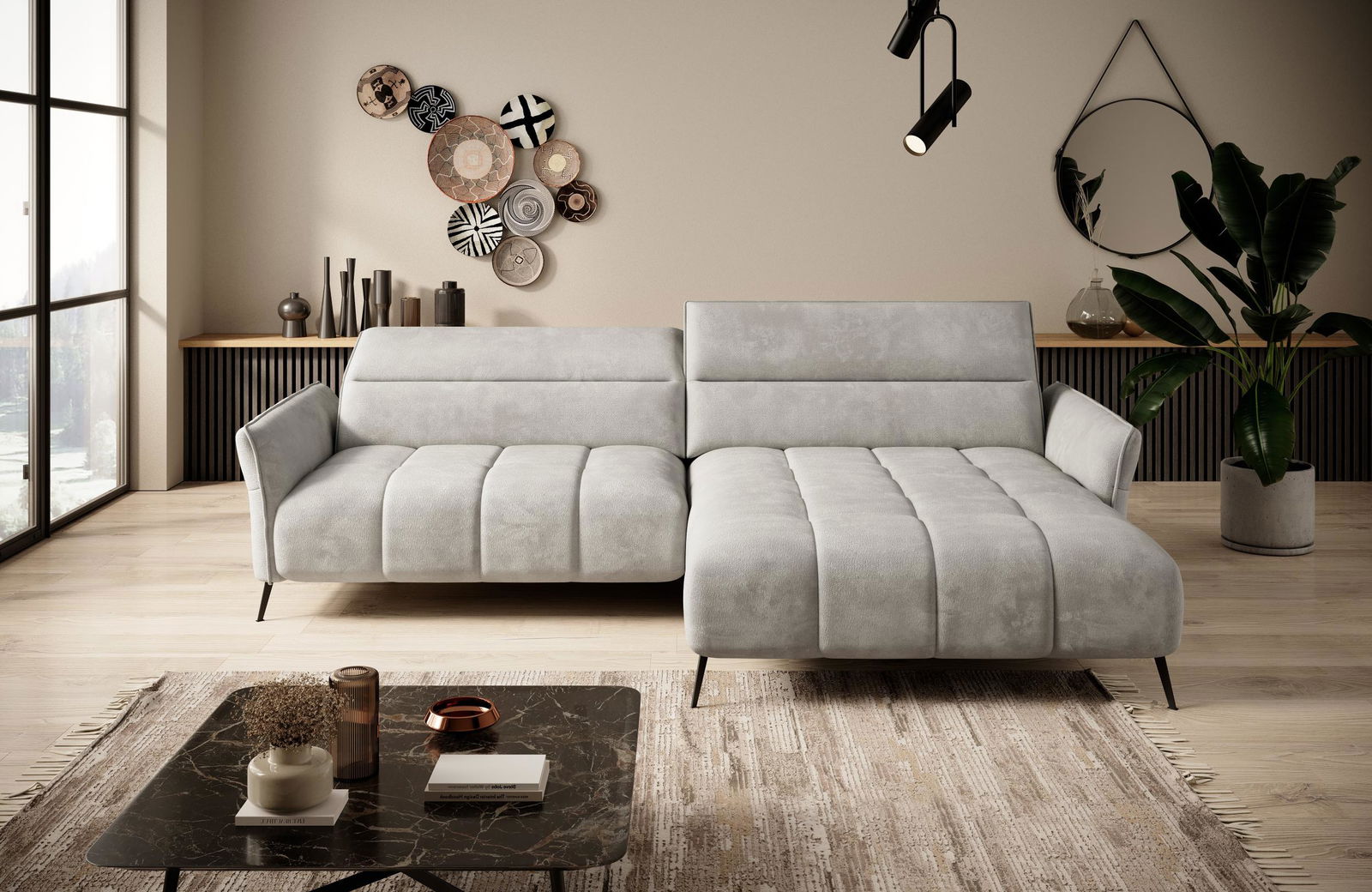 Γωνιακός καναπές Caravan μίνιμαλ σχεδιασμού με βολικές διαστάσεις που τον καθιστούν ιδανική επιλογή ακόμα και για μικρότερα σπίτια. Τα ρυθμιζόμενα σε ύψος προσκέφαλα καθώς και το ηλεκτρικα ρυθμιζόμενο βάθος καθίσματος θα χαρίσουν στιγμές χαλάρωσης σε εσας και τους φίλους σας.