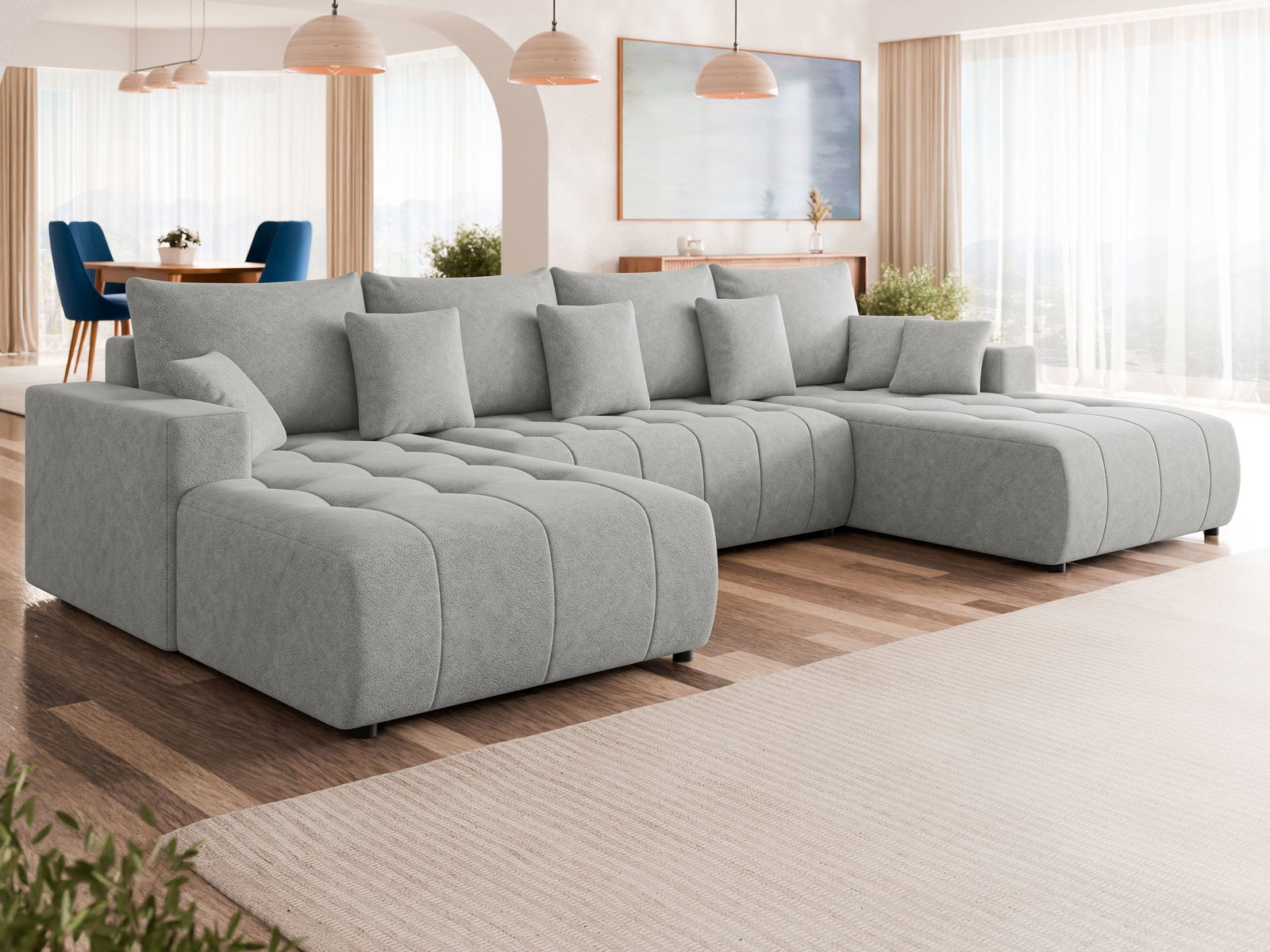 Ο μοναδικός γωνιακός καναπές Fabio σε σχήμα U συνδυάζει το μοντέρνο στυλ με το υψηλότερο επίπεδο άνεσης. Το φαρδύ κάθισμα και οι μαλακές πλάτες του προάγουν τη χαλάρωση μετά από μια κουραστική μέρα, και χάρη στη λειτουργία ύπνου, μπορεί να μετατραπεί σε ένα άνετο κρεβάτι μέσα σε λίγα λεπτά.