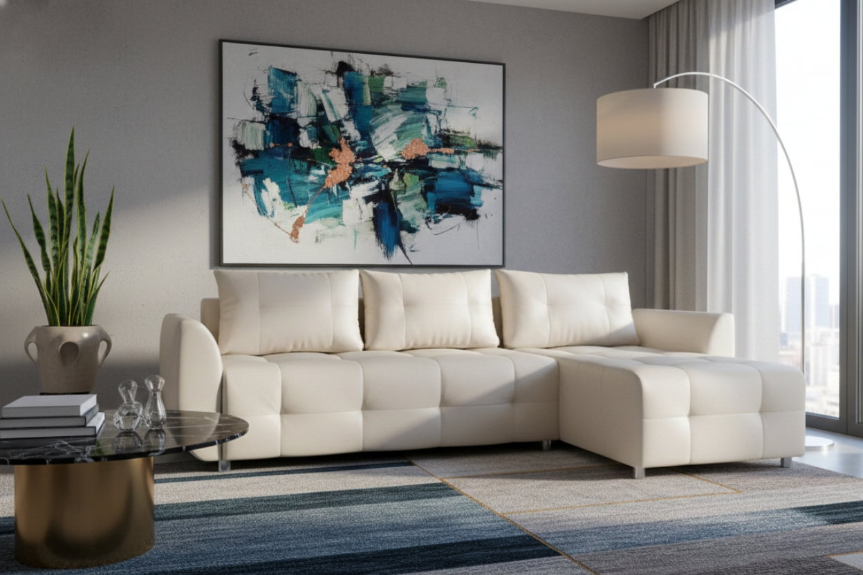 Σαλόνι γωνία Marten κομψού σχεδιασμού με όμορφη διακόσμηση στην επιφάνεια.