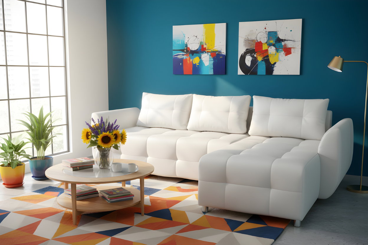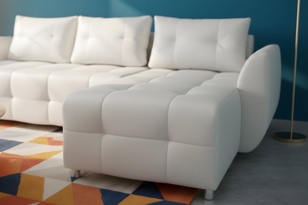 Σαλόνι γωνία Marten κομψού σχεδιασμού με όμορφη διακόσμηση στην επιφάνεια.