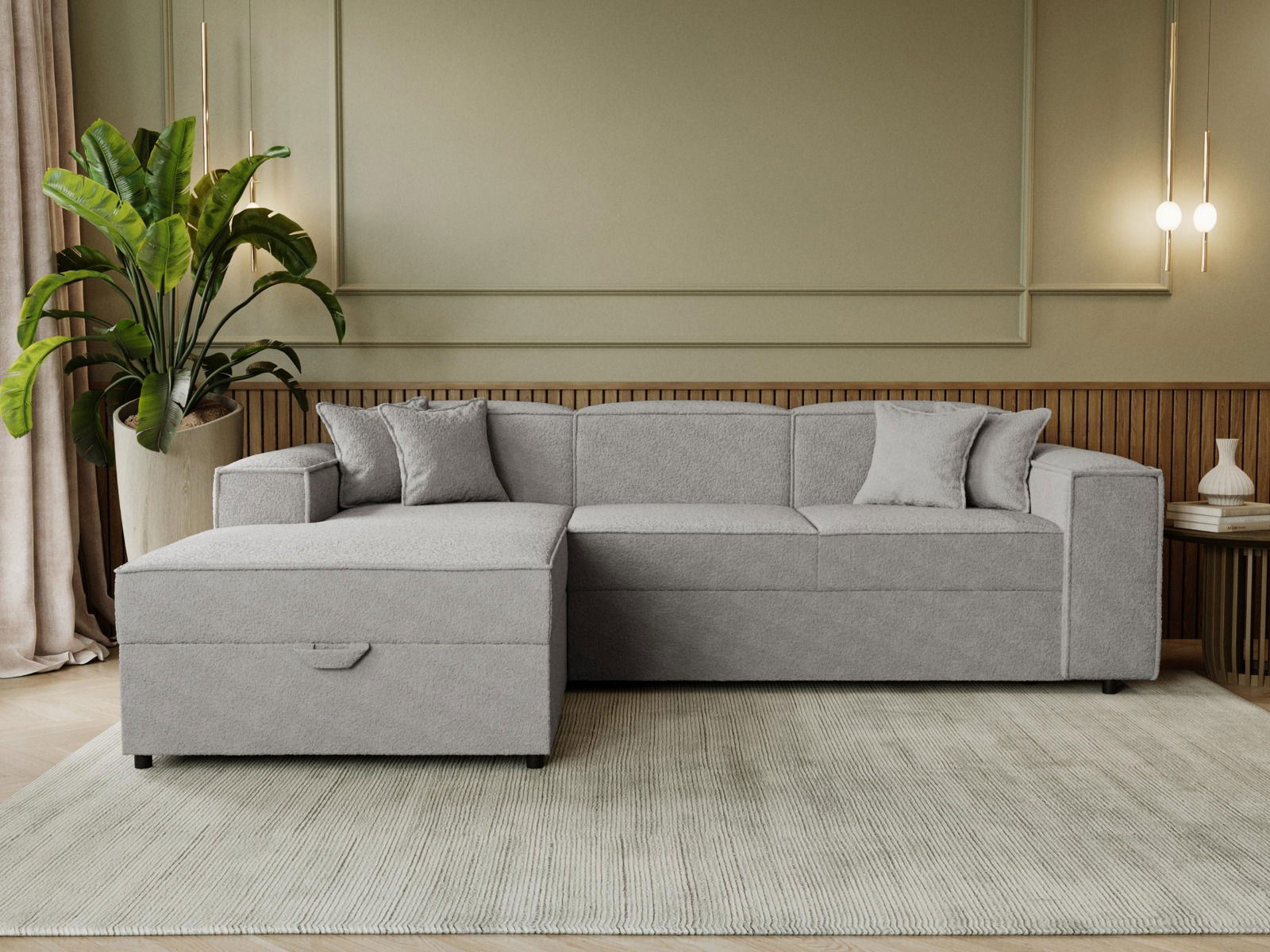 Ο γωνιακός καναπές Santos συνδυάζει άνεση και στυλ, με κομψή επένδυση boucle και διακοσμητικές ραφές που αναδεικνύουν τη γεωμετρική του γραμμή.