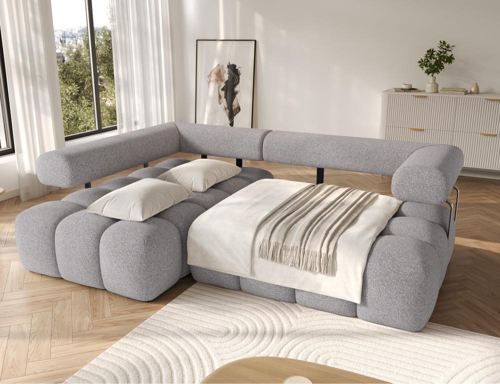 Γωνιακός Καναπές Velly υψηλής κομψότητας και μοντέρνου σχεδιασμού, ένα κομμάτι που αναδεικνύει τον χώρο με καθαρή αισθητική και διακριτική πολυτέλεια. Με άνετες διαστάσεις και εύκολη μετατροπή σε κρεβάτι, προσφέρει ευελιξία και αρμονία στο καθημερινό σας περιβάλλον.
