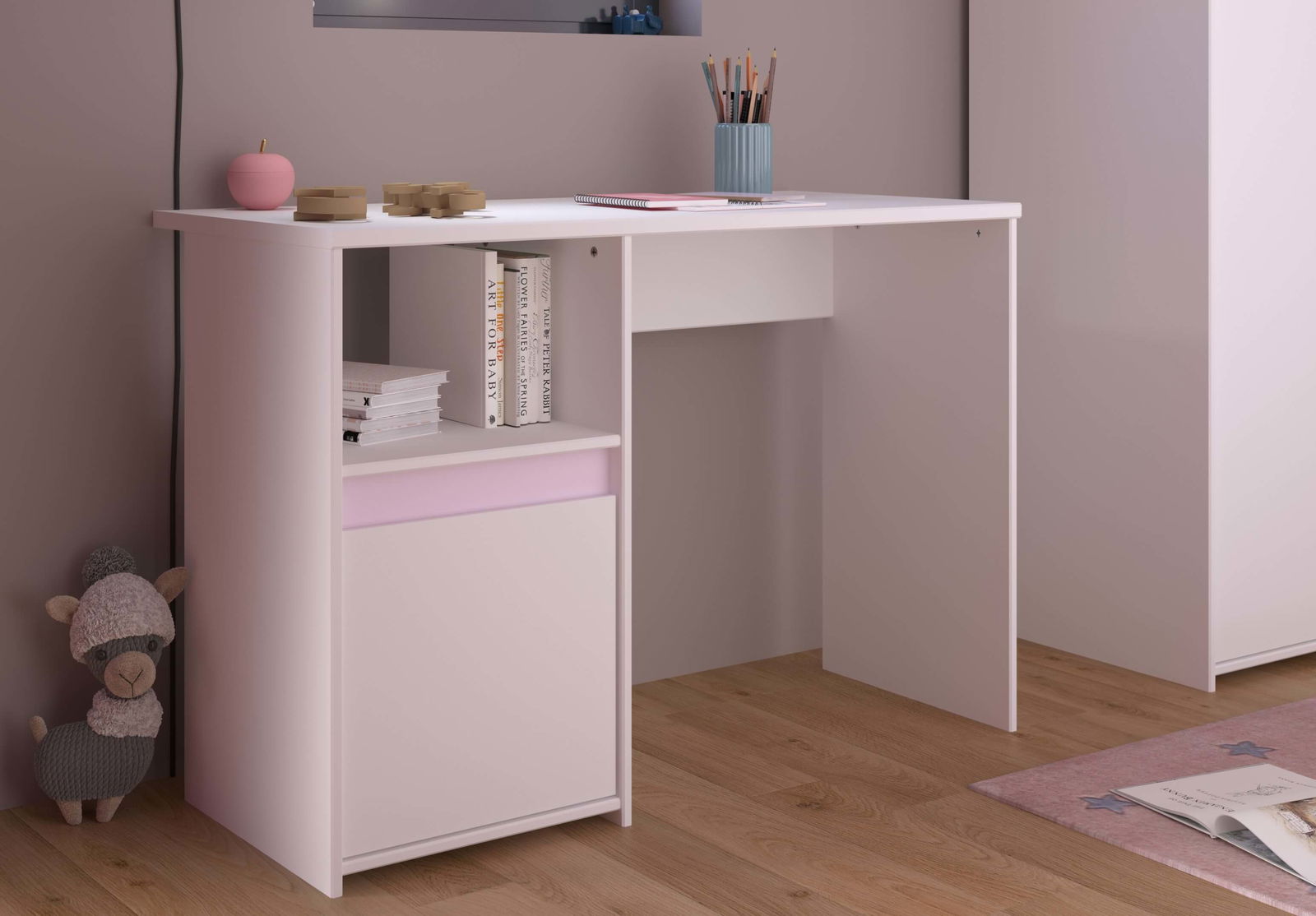 Γραφείο Ballet, λιτού σχεδιασμού, που θα προσφέρει στο παιδί σας μία ευρύχωρη επιφάνεια γραφείου. Τα χρωματιστά μέρη του επίπλου είναι αντιστρέψιμα δίνοντας σας την επιλογή να προσθέσετε είτε ροζ είτε γκρι λεπτομέρειες στον χώρο σας. Συνδυάστε την ιδανικά με τα υπόλοιπα έπιπλα της σειράς για ένα ολοκληρωμένο αποτέλεσμα επίπλωσης.