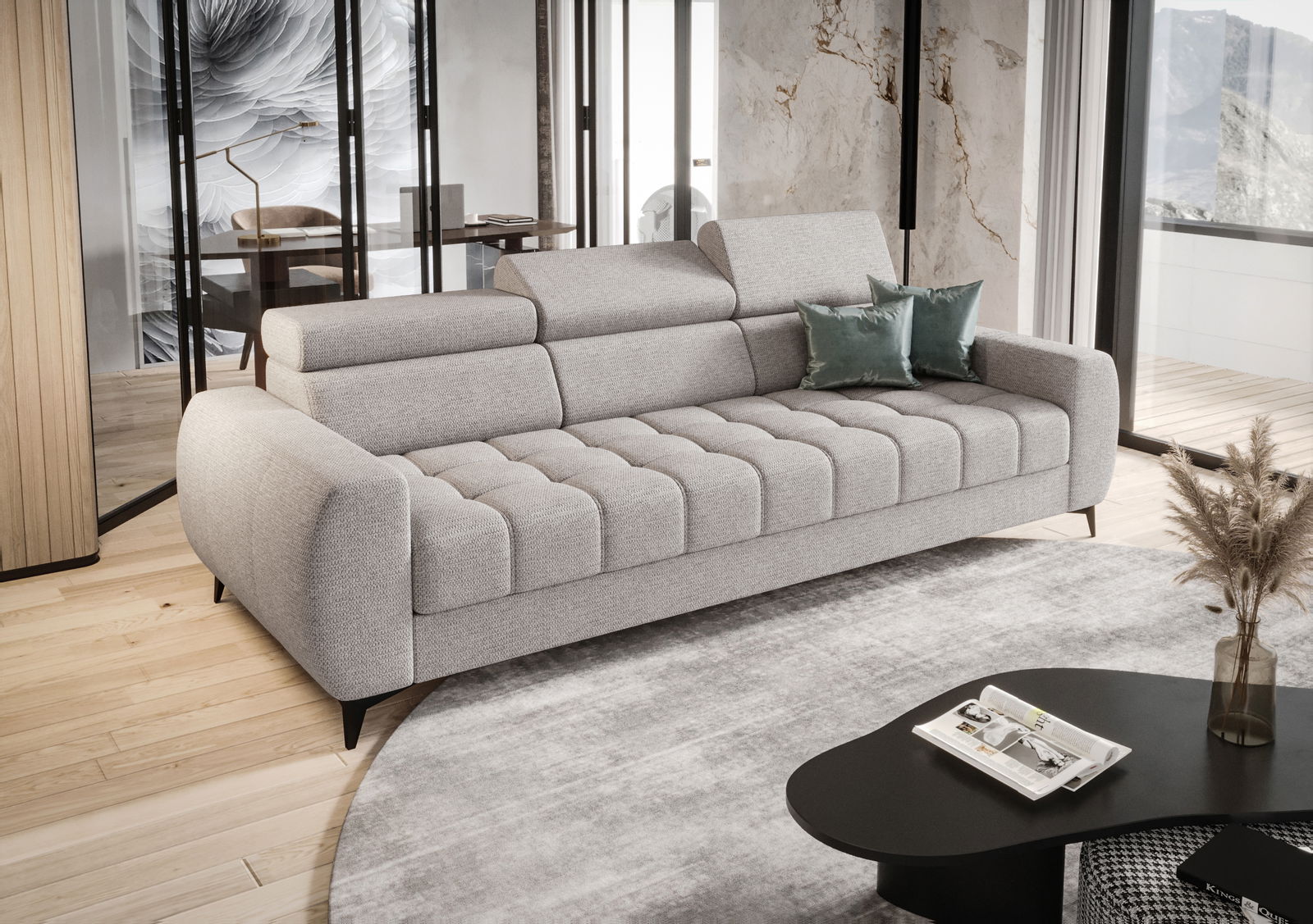 Ο τριθέσιος καναπές Calyra ξεχωρίζει για την μοναδική αισθητική του και το άνετο και ευρύχωρο κάθισμα του. Προσφέρει ρυθμιζόμενα προσκέφαλα για μέγιστη άνεση. Η αισθητική αυτού του μοντέλου του επιτρέπει να χρησιμοποιείται τόσο σε κλασικούς όσο και σε μοντέρνους χώρους.