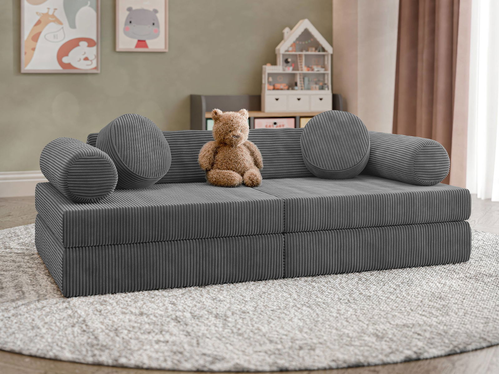 Ο καναπές κρεβάτι Adell είναι μια εξαιρετική λύση για το παιδικό δωμάτιο. Αυτό το αρθρωτό μοντέλο δεν είναι μόνο ιδανικό για χαλάρωση, αλλά προσφέρει και ατελείωτες δυνατότητες παιχνιδιού! Χάρη στις ευέλικτες διαμορφώσεις του, ο καναπές διεγείρει τη δημιουργικότητα στα παιδιά. Μπορεί να μετατραπεί σε ένα μικρό φρούριο, ένα κατάστημα ή ότι άλλο φανταστεί το παιδί.