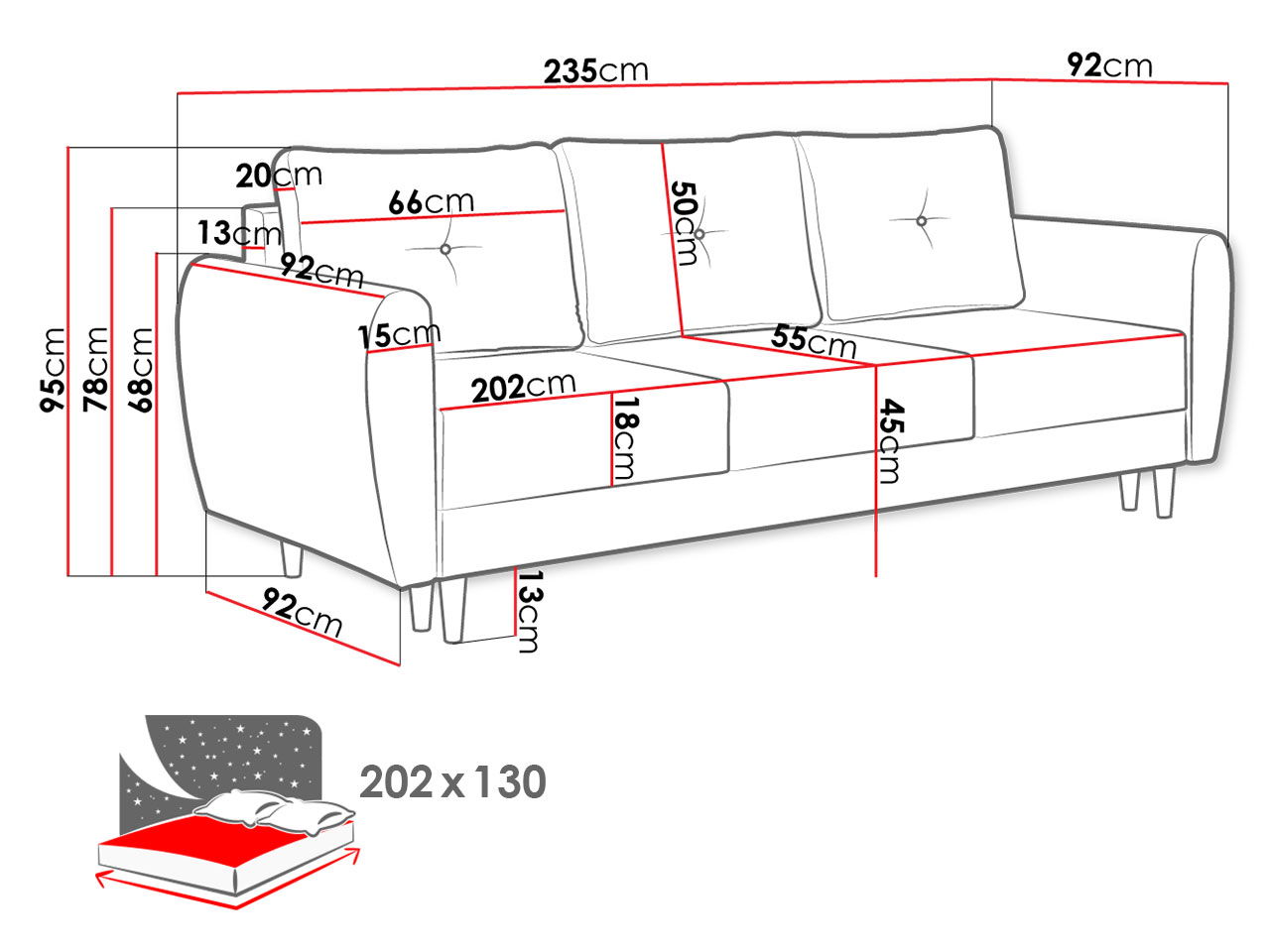 – Εύκολη μετατροπή σε κρεβάτι διαστάσεων 202 x 130 cm
