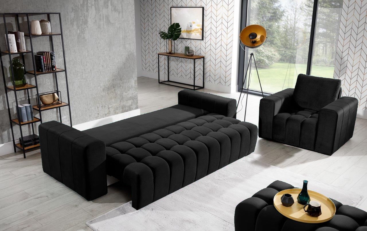 Καναπές – κρεβάτι Valentino, σε κλασικό σχεδιασμό με μοντέρνες λεπτομέρειες κυβικού σχεδιασμού στο κάθισμα, θα προσφέρει σε εσάς και την οικογένειά σας στιγμές χαλάρωσης αλλά και ξεκούρασης κατά την διάρκεια του ύπνου καθώς μετατρέπεται εύκολα σε κρεβάτι.