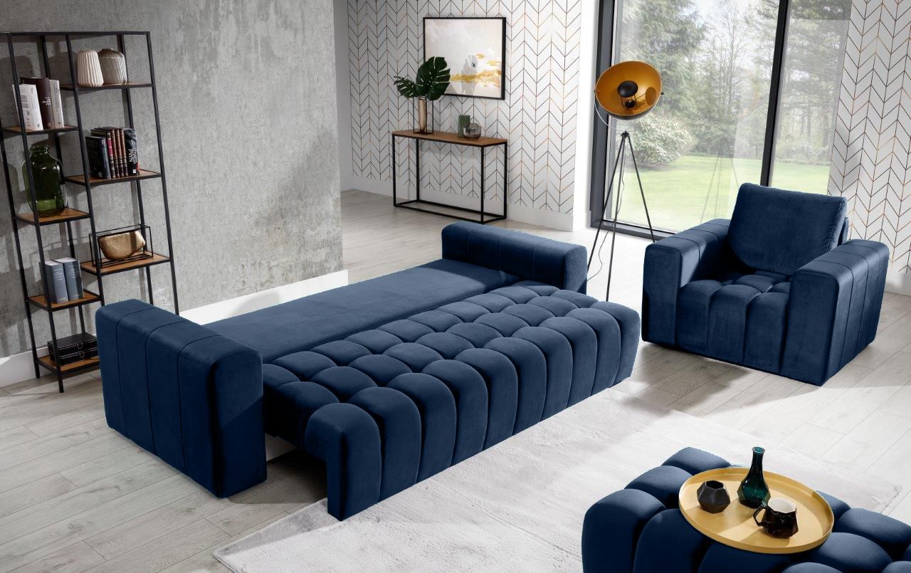 Καναπές – κρεβάτι Valentino, σε κλασικό σχεδιασμό με μοντέρνες λεπτομέρειες κυβικού σχεδιασμού στο κάθισμα, θα προσφέρει σε εσάς και την οικογένειά σας στιγμές χαλάρωσης αλλά και ξεκούρασης κατά την διάρκεια του ύπνου καθώς μετατρέπεται εύκολα σε κρεβάτι.