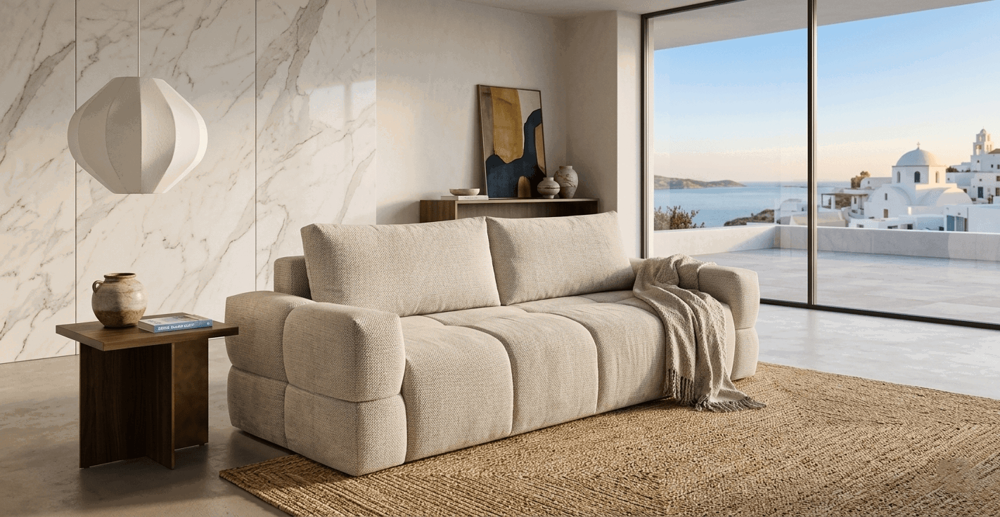 Ο Τριθέσιος Καναπές Taleria αποτελεί μια πρόταση που επαναπροσδιορίζει την έννοια της στιβαρής κομψότητας στο καθιστικό. Ο σχεδιασμός του βασίζεται σε χαμηλό προφίλ και μεγάλους όγκους, δημιουργώντας μια επιβλητική παρουσία που προσκαλεί για χαλάρωση.