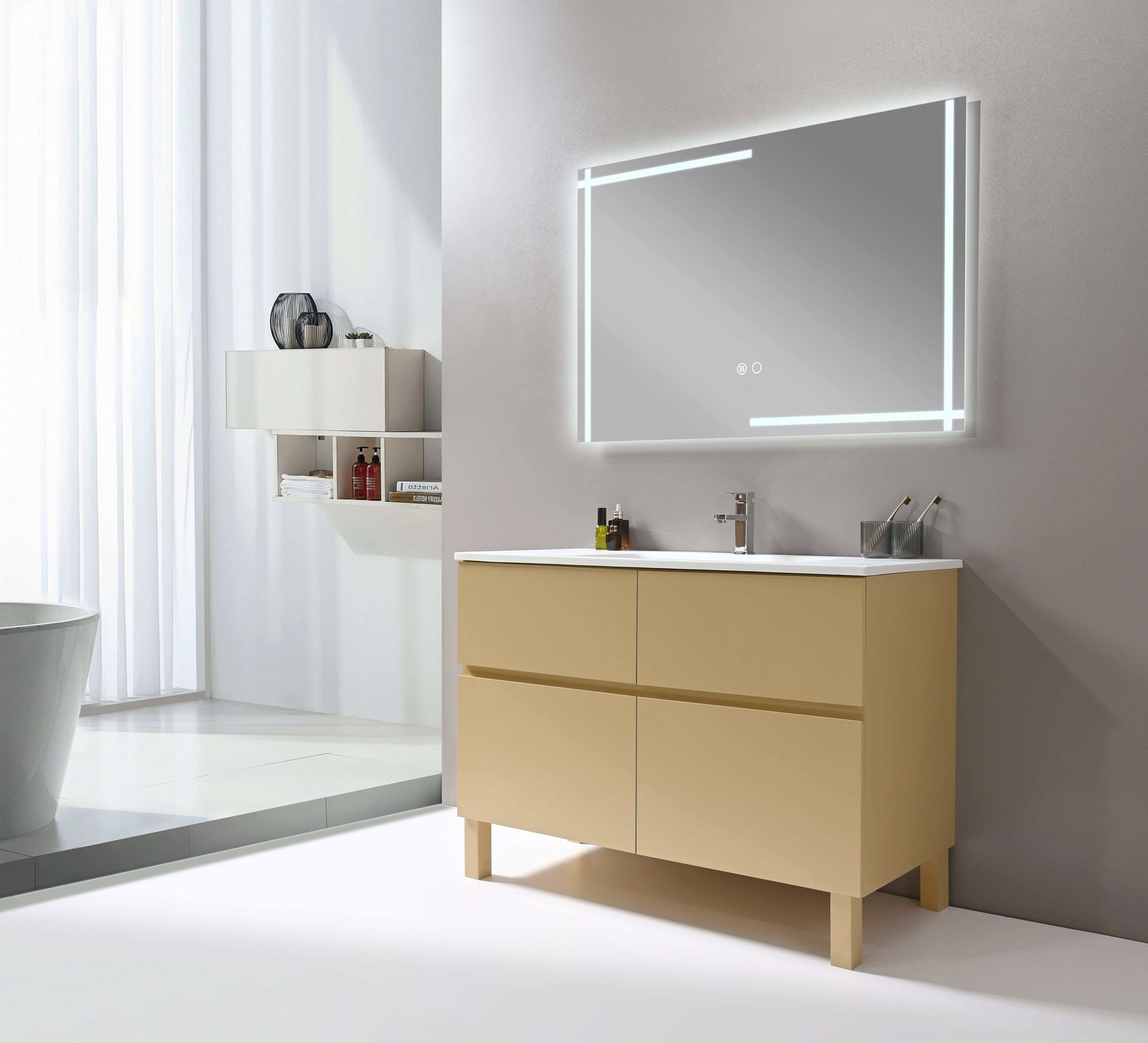 Καθρέπτης Mahonia, με αυστηρά τετράγωνη γεωμετρία που δίνει δομή και συμμετρία στον χώρο, αναδεικνύοντας τη μοντέρνα αισθητική του μπάνιου. Ο περιμετρικός LED φωτισμός τονίζει καθαρά τις γραμμές του και δημιουργεί μια αίσθηση φωτεινής καθαρότητας.