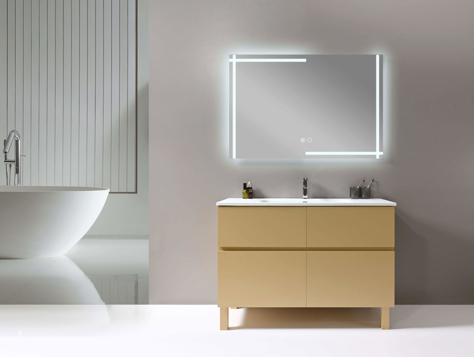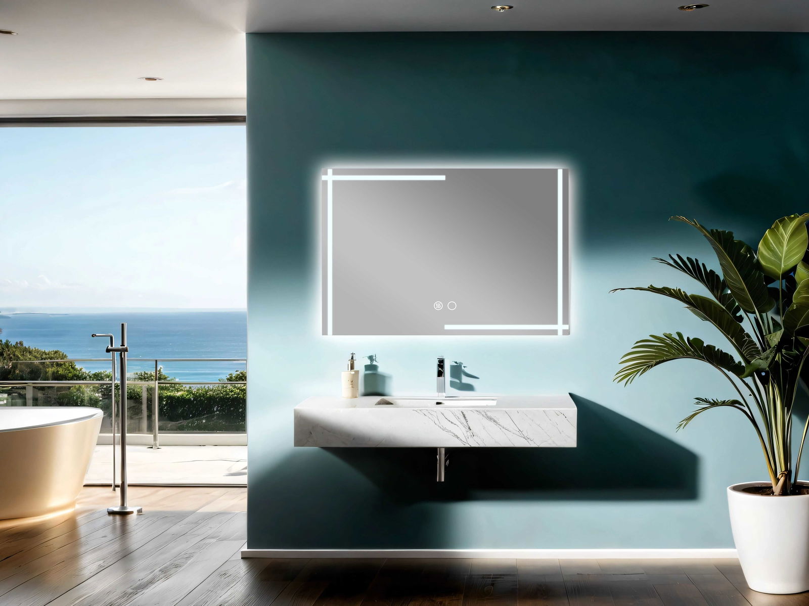 Καθρέπτης Mahonia, με αυστηρά τετράγωνη γεωμετρία που δίνει δομή και συμμετρία στον χώρο, αναδεικνύοντας τη μοντέρνα αισθητική του μπάνιου. Ο περιμετρικός LED φωτισμός τονίζει καθαρά τις γραμμές του και δημιουργεί μια αίσθηση φωτεινής καθαρότητας.