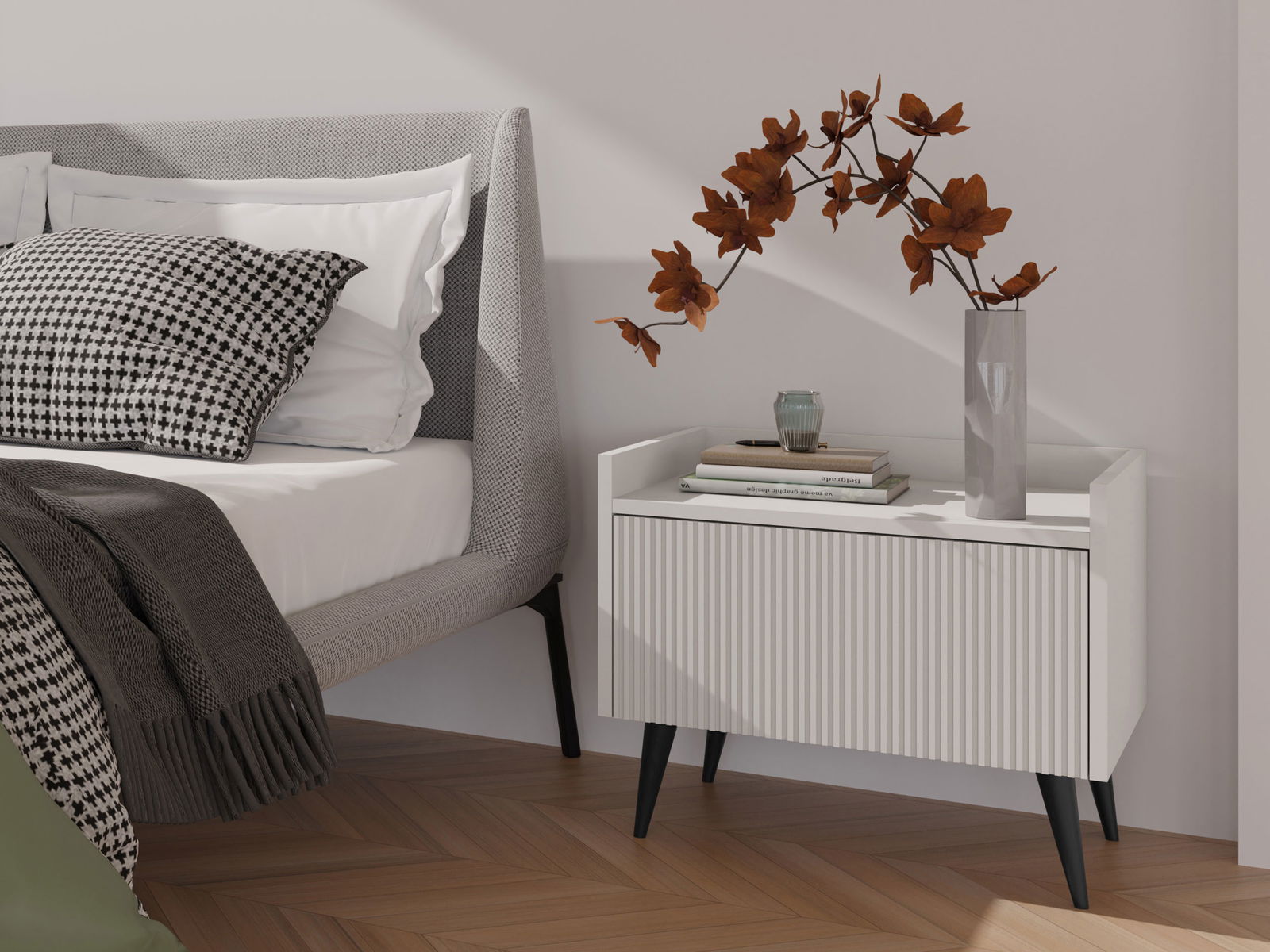 Το σύγχρονο κομοδίνο Ademo προσφέρει ένα μείγμα στυλ και πρακτικότητας για την κρεβατοκάμαρά σας. Η μοναδική μπροστινή όψη με υφή προσθέτει μια πινελιά οπτικού ενδιαφέροντος, ενώ οι καθαρές γραμμές και ο μινιμαλιστικός σχεδιασμός συμπληρώνουν τους μοντέρνους εσωτερικούς χώρους. Ένα ευρύχωρο συρτάρι παρέχει άφθονο χώρο αποθήκευσης για τα απαραίτητα είδη του κομοδίνου σας.